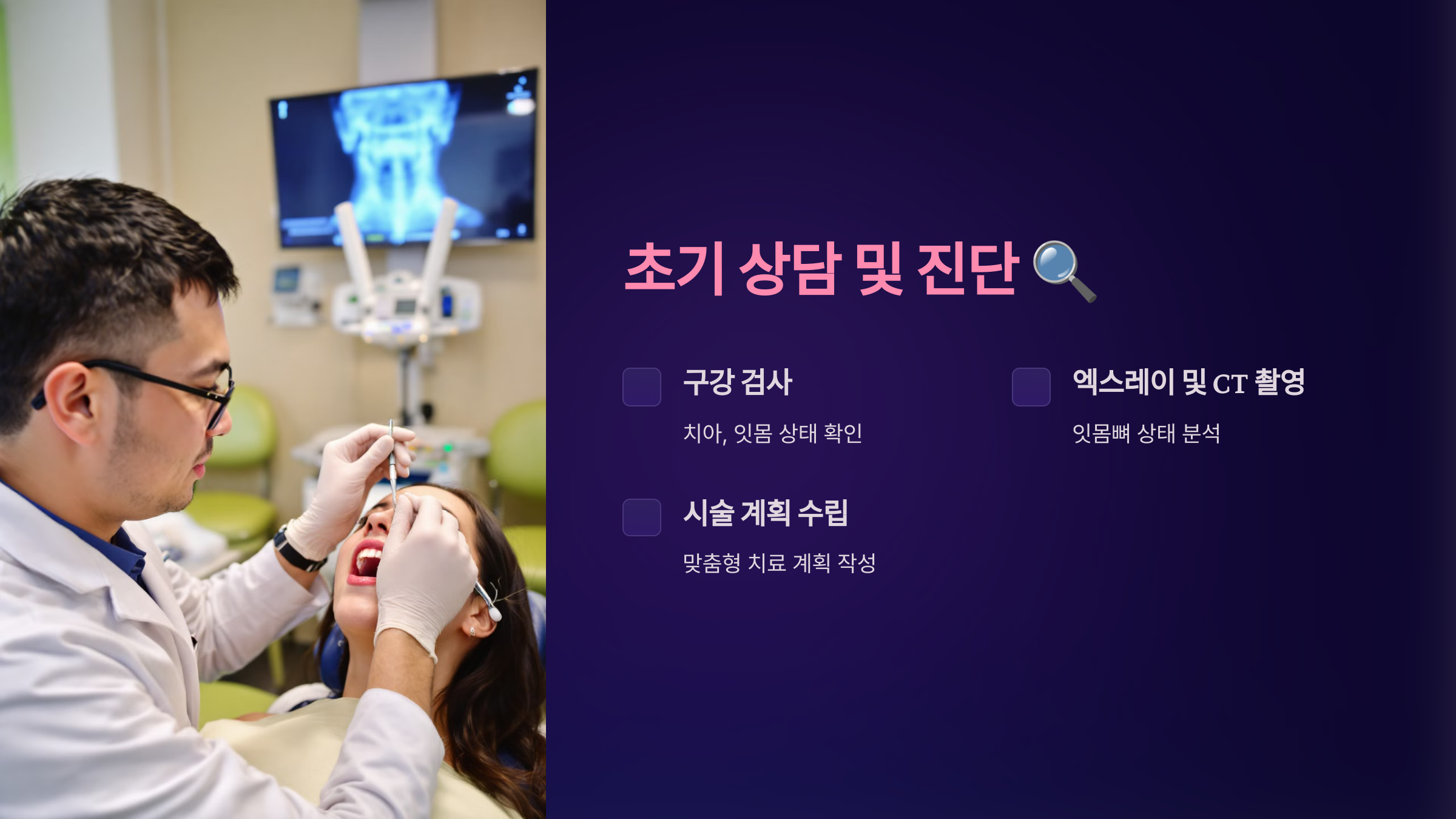 - 구강 검사: 치아와 잇몸 상태를 확인하고 결손 치아 위치를 진단합니다.