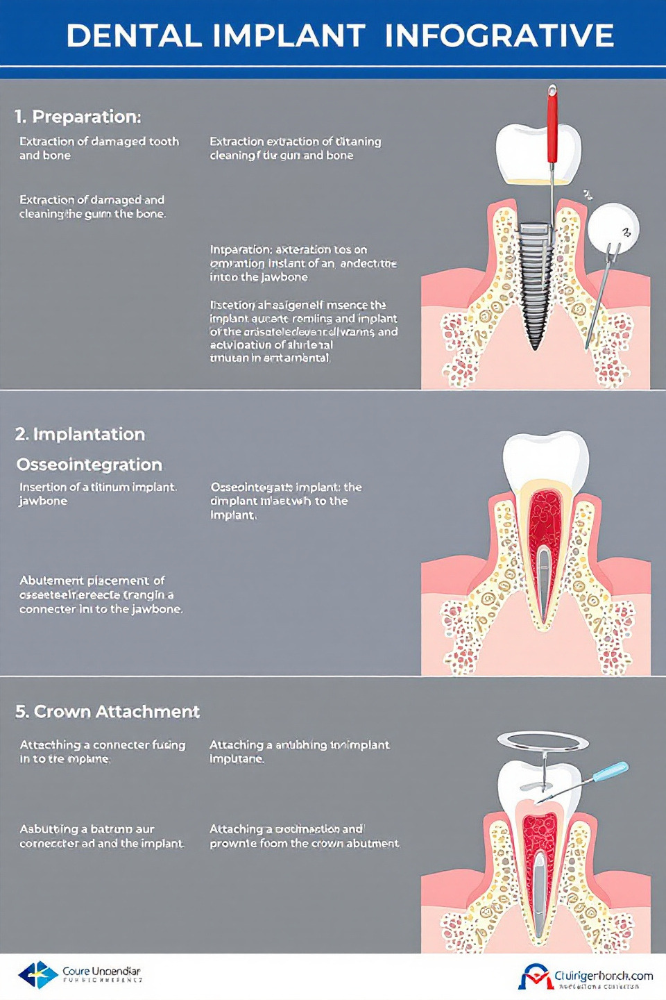 임플란트 시술은 대체로 3단계로 이루어집니다: 준비 단계, 임플란트 식립 단계, 보철물 부착 단계입니다.