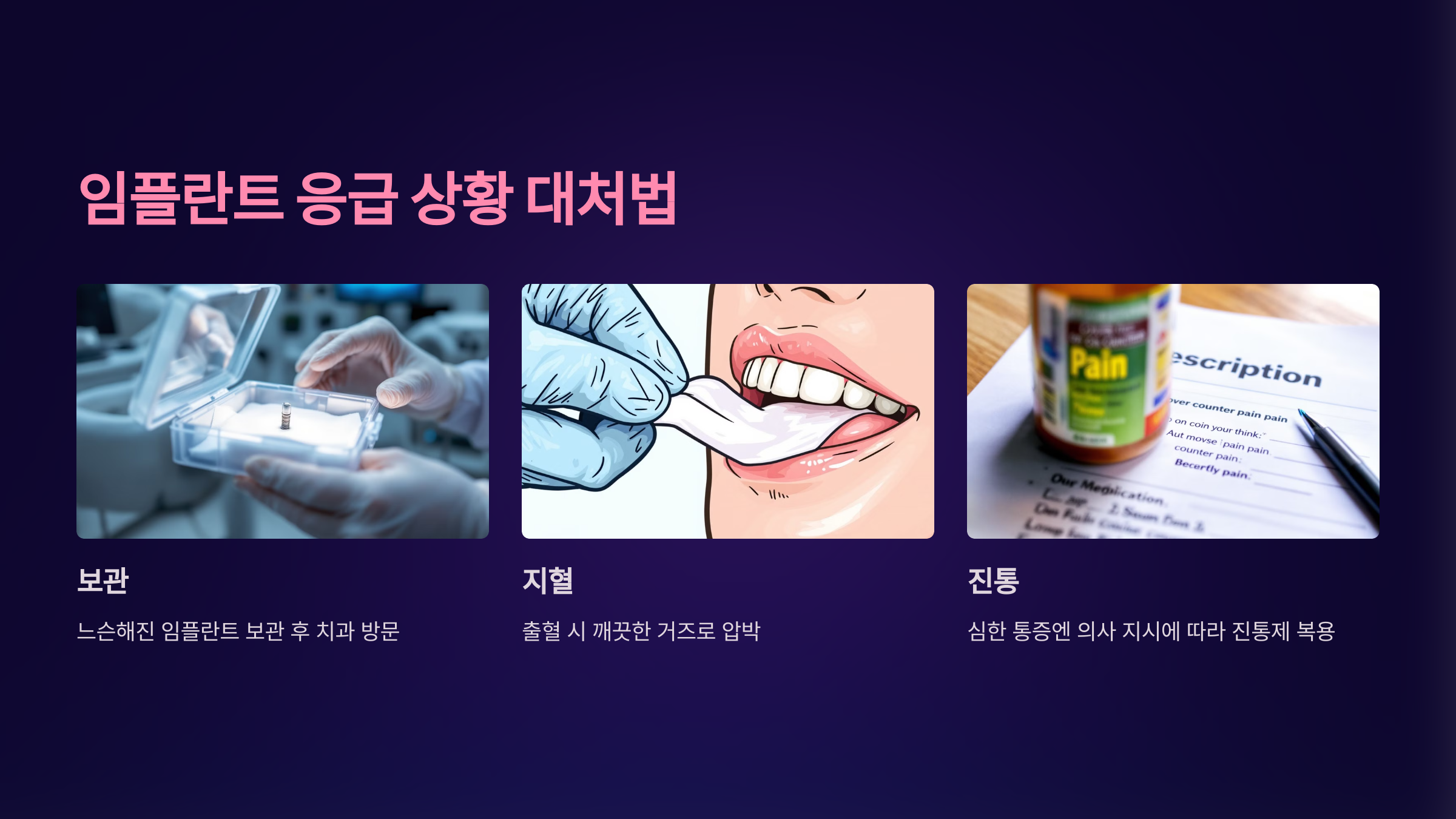 임플란트와 관련된 응급 상황에서는 신속하고 올바른 대처가 필요합니다.