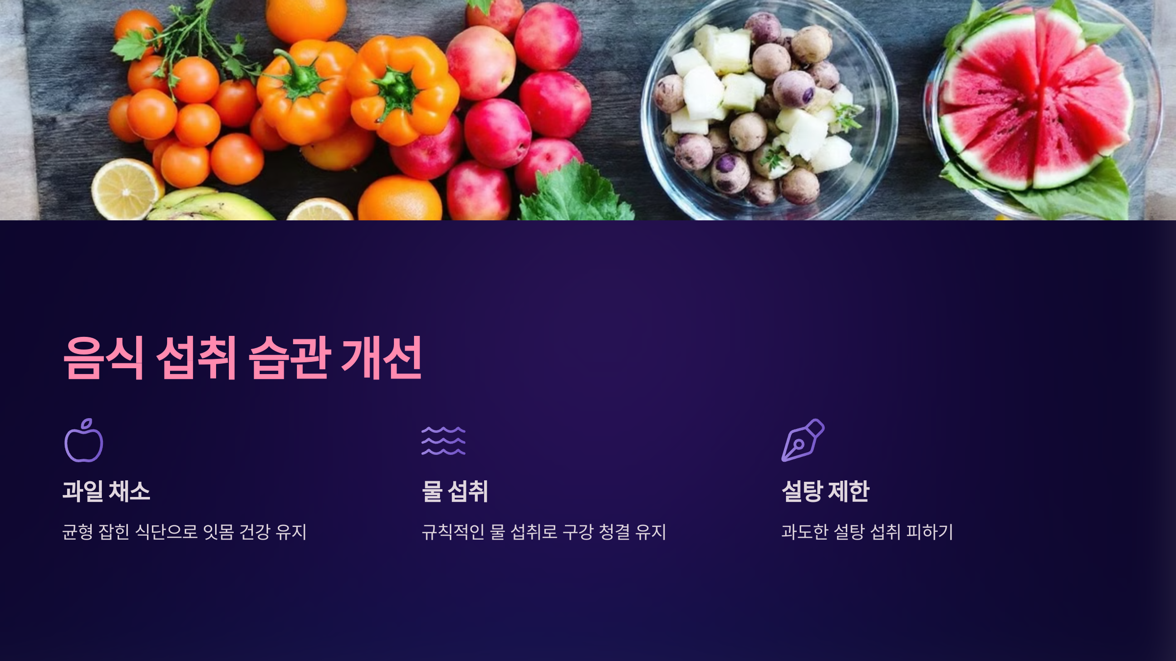 채소와 과일 위주의 균형 잡힌 식단은 잇몸 건강에도 좋습니다.
