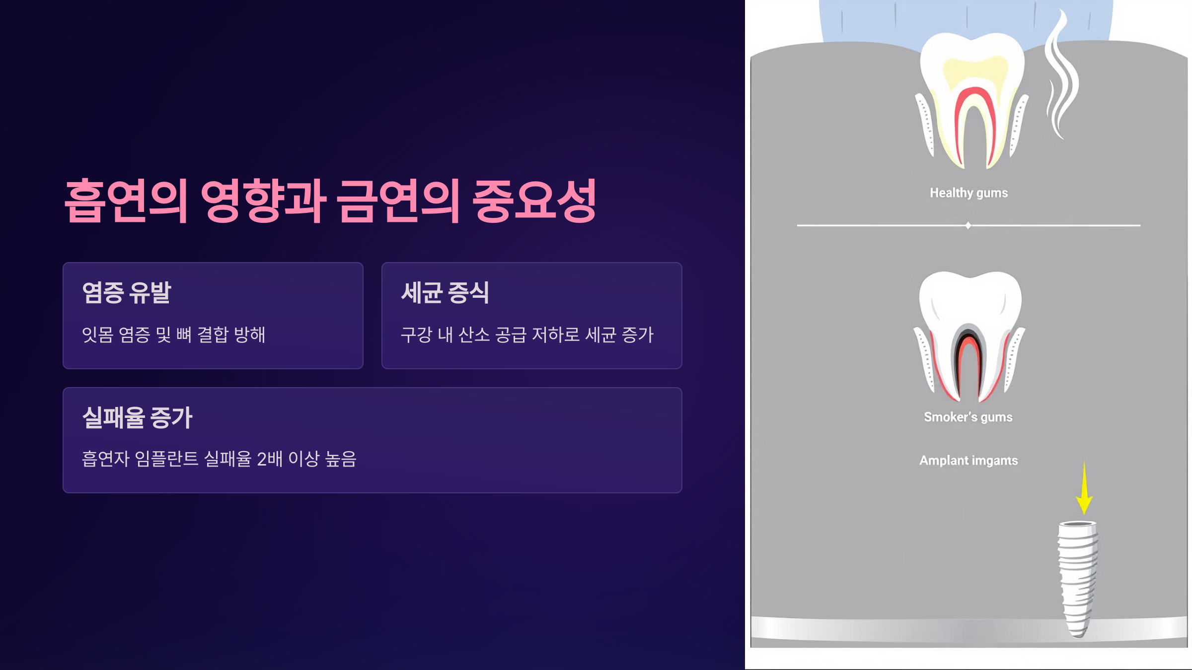 흡연은 잇몸 염증을 유발하며 임플란트의 뼈 결합을 방해할 수 있습니다.
