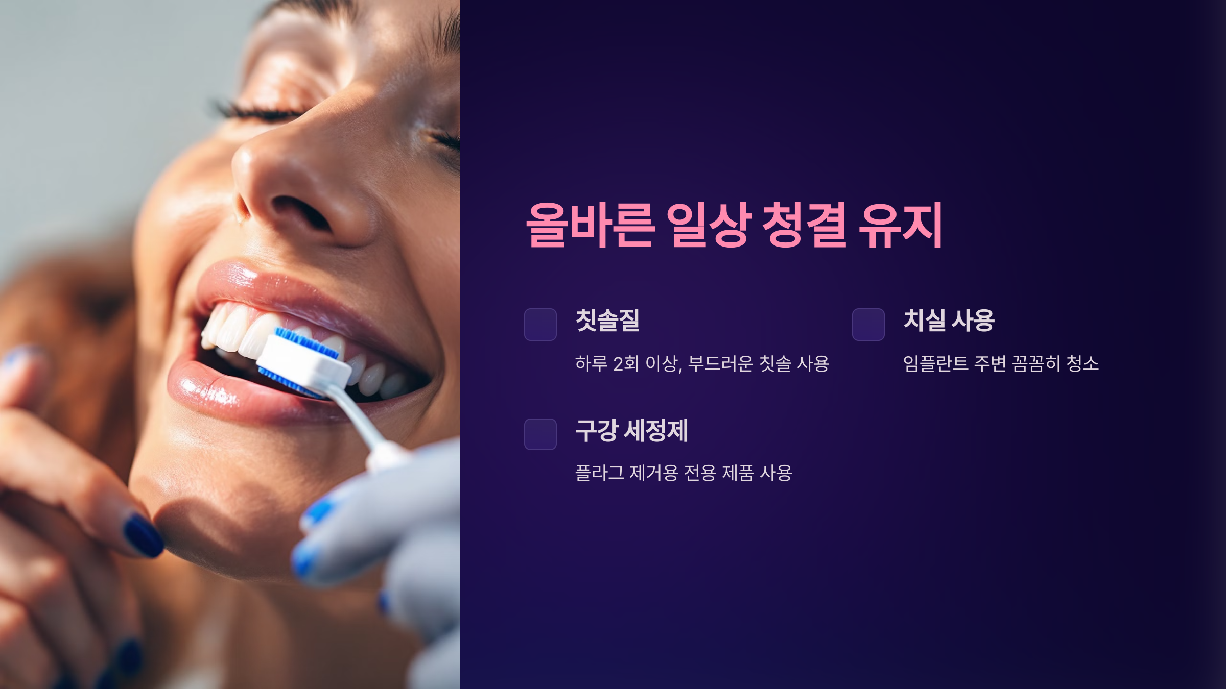 임플란트를 오래 유지하려면 올바른 일상 청결 관리가 필수적입니다.