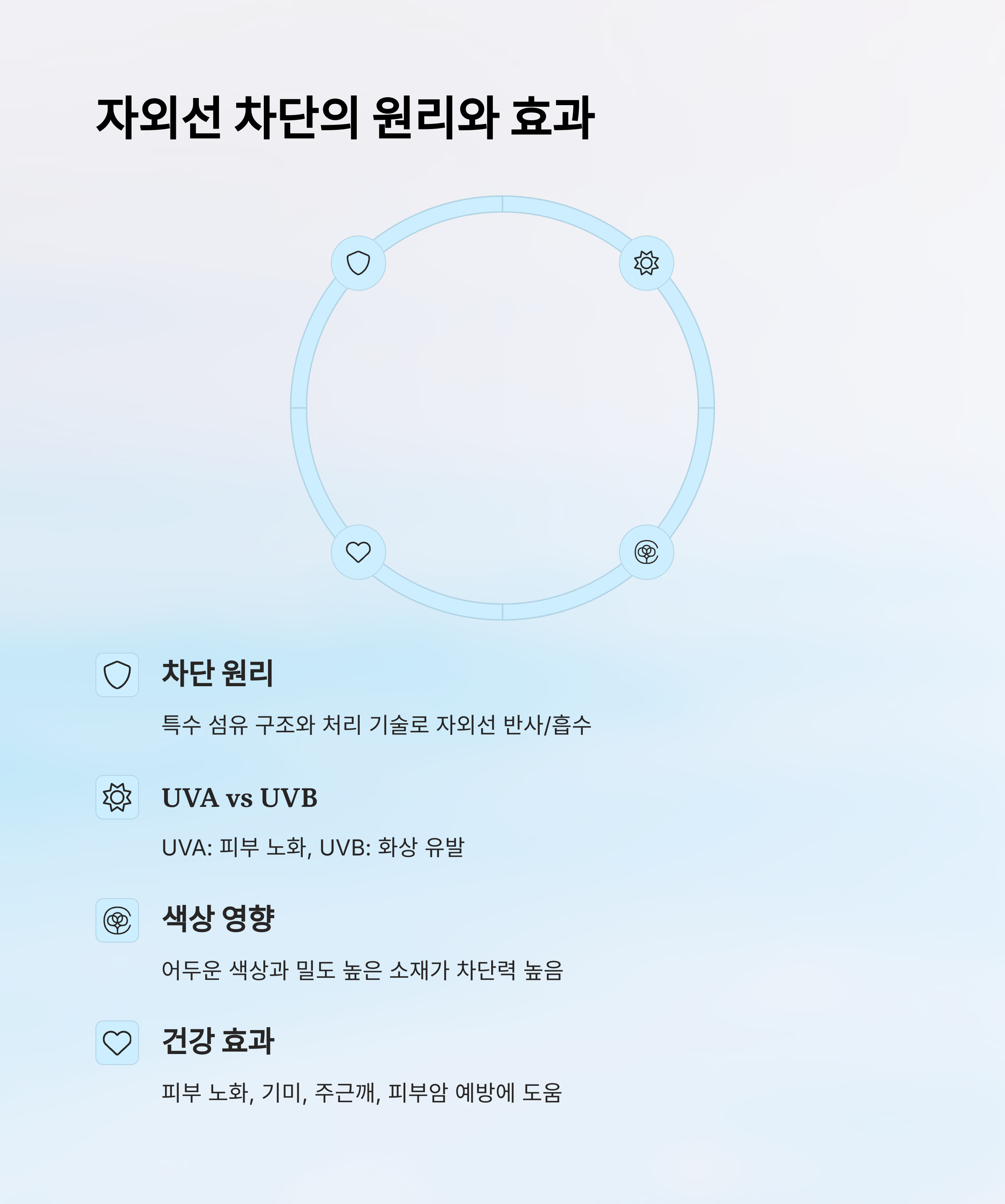 또한, 차단 효과는 섬유의 밀도나 색상에도 영향을 받아요. 어두운 색의 밀도 높은 소재는 더 많은 자외선을 흡수하고 반사해서 차단력이 높답니다. 밝은 색은 열 흡수가 덜 하지만 차단율은 떨어질 수 있어요.