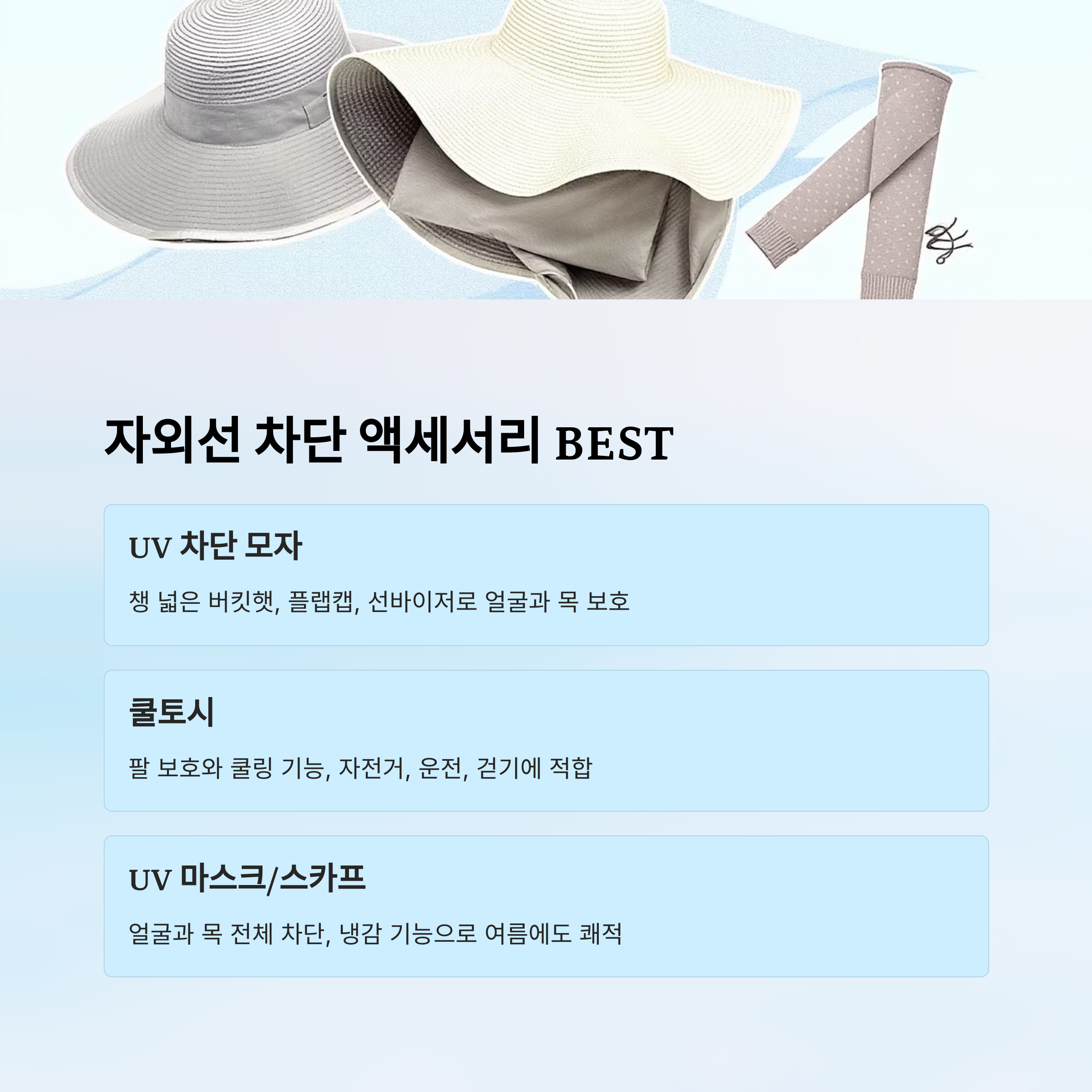 자외선 차단 액세서리는 작지만 강력한 효과가 있어요. 가격도 부담 없고 다양하게 활용할 수 있으니 꼭 챙겨보세요! 😎 모자 하나로 얼굴 그늘을 만들고, 쿨토시 하나로 팔을 덮어주는 것만으로도 피부를 훨씬 보호할 수 있어요.