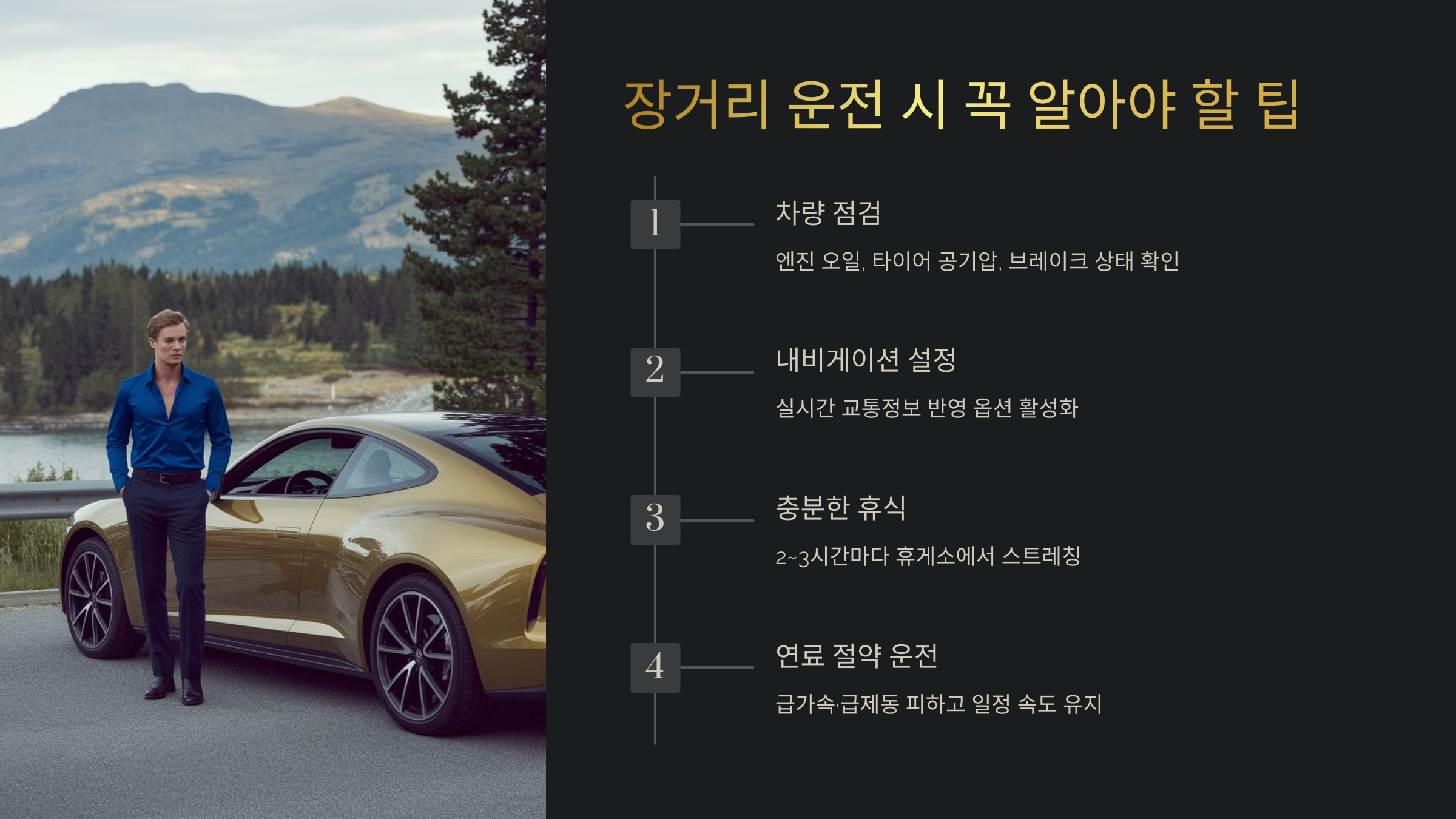 첫째, 출발 전에 차량 점검을 꼭 해야 해요. 엔진 오일, 타이어 공기압, 브레이크 상태 등을 확인하면 장거리 운전 중 예기치 않은 사고를 방지할 수 있어요.