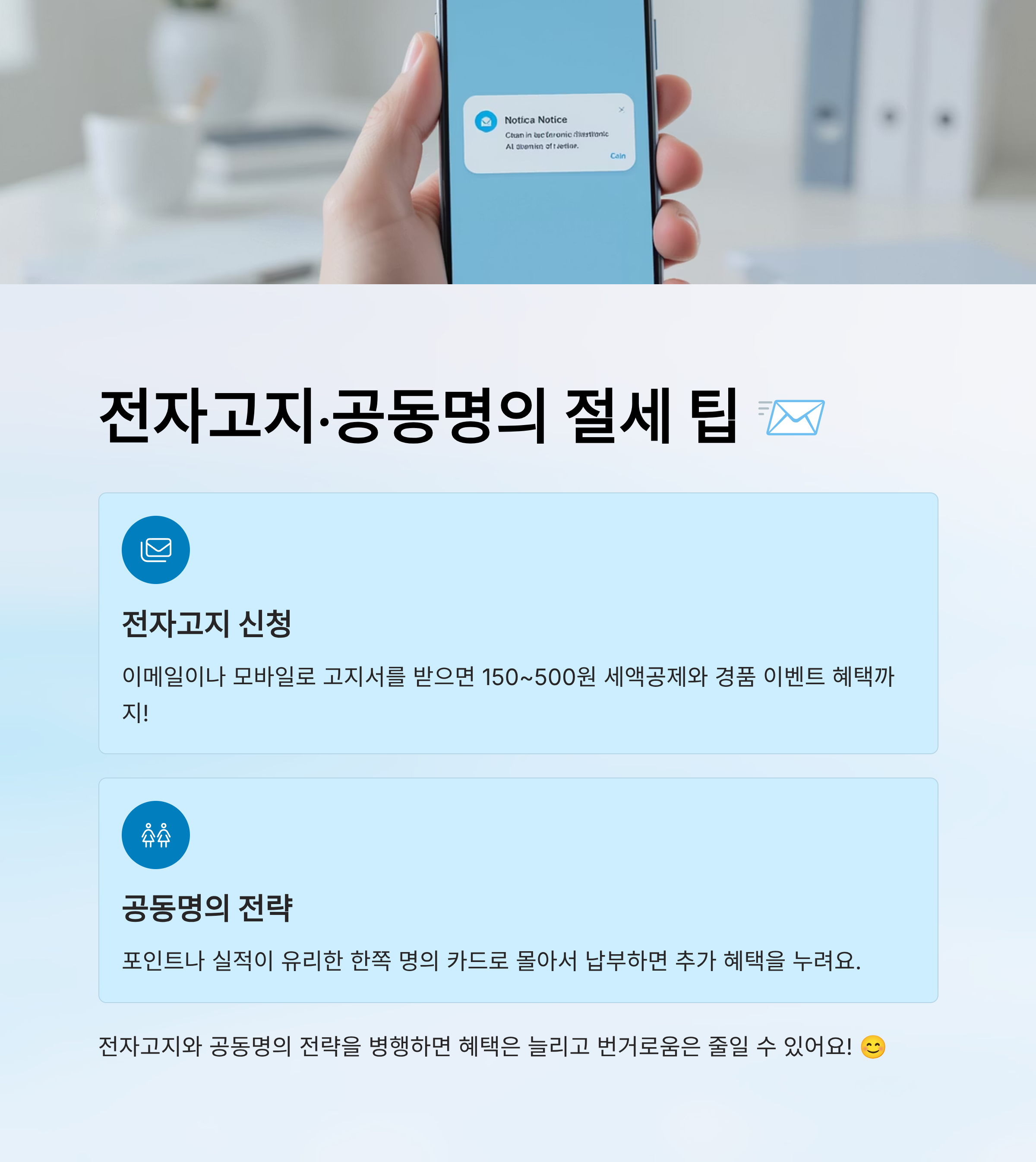 전자고지와 공동명의 전략을 병행하면, 혜택은 늘리고 번거로움은 줄일 수 있어요. 이런 ‘숨은 절세 전략’들이 실제로 큰 도움이 된다는 점! 꼭 활용해보세요. 😊