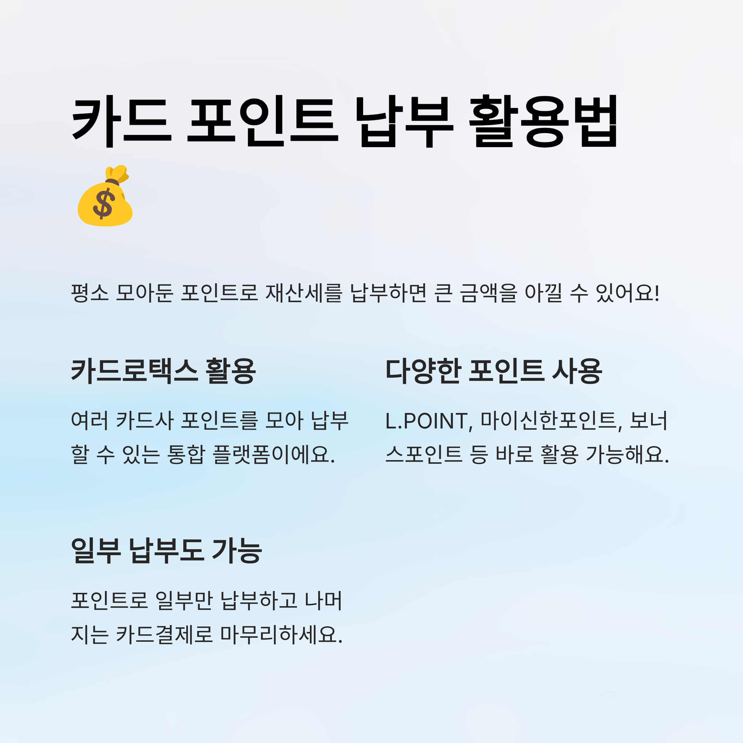 카드사 포인트, 평소에는 소소하게 사용하는 분들이 많지만, 재산세 납부 때 모아둔 포인트를 활용하면 꽤 큰 금액을 아낄 수 있어요!