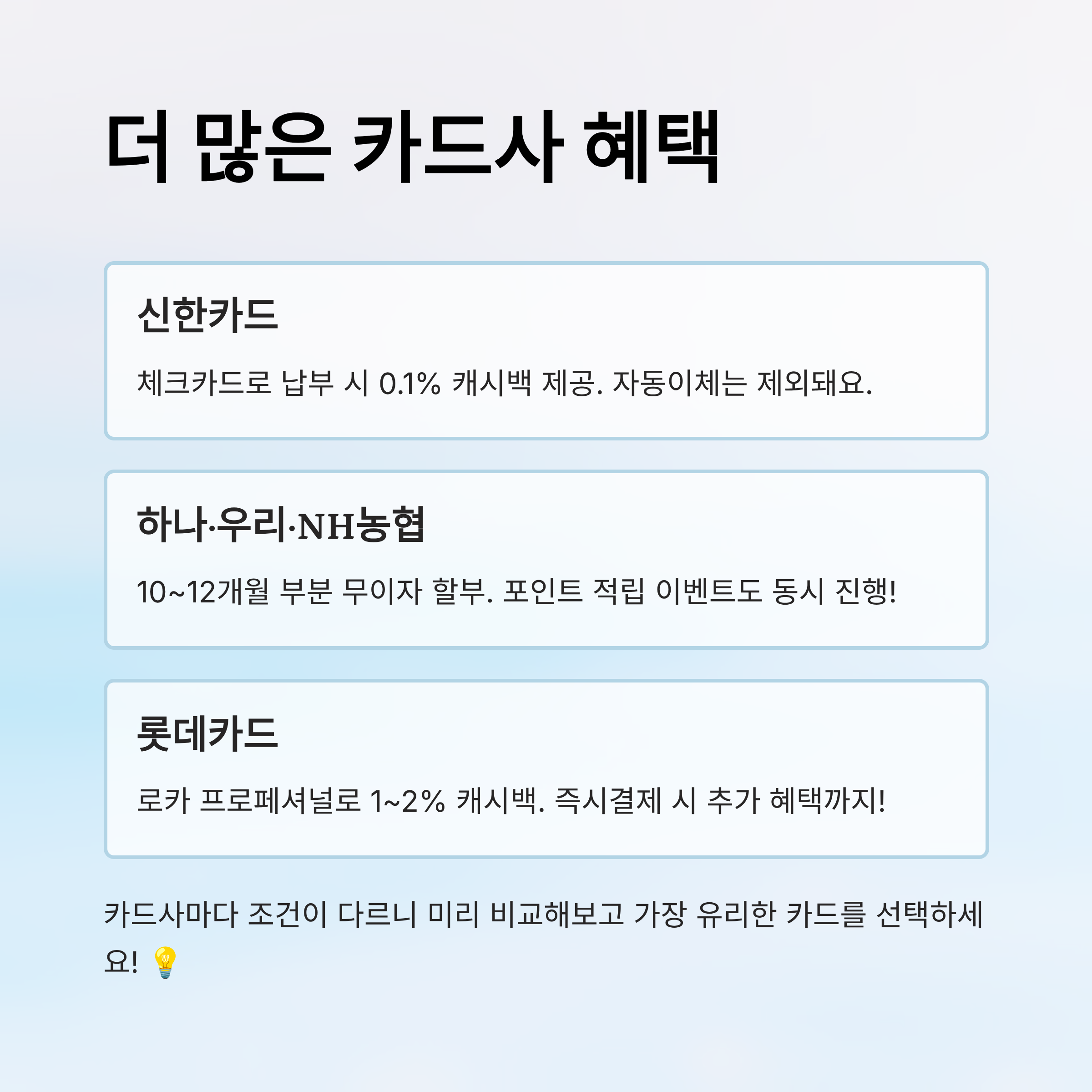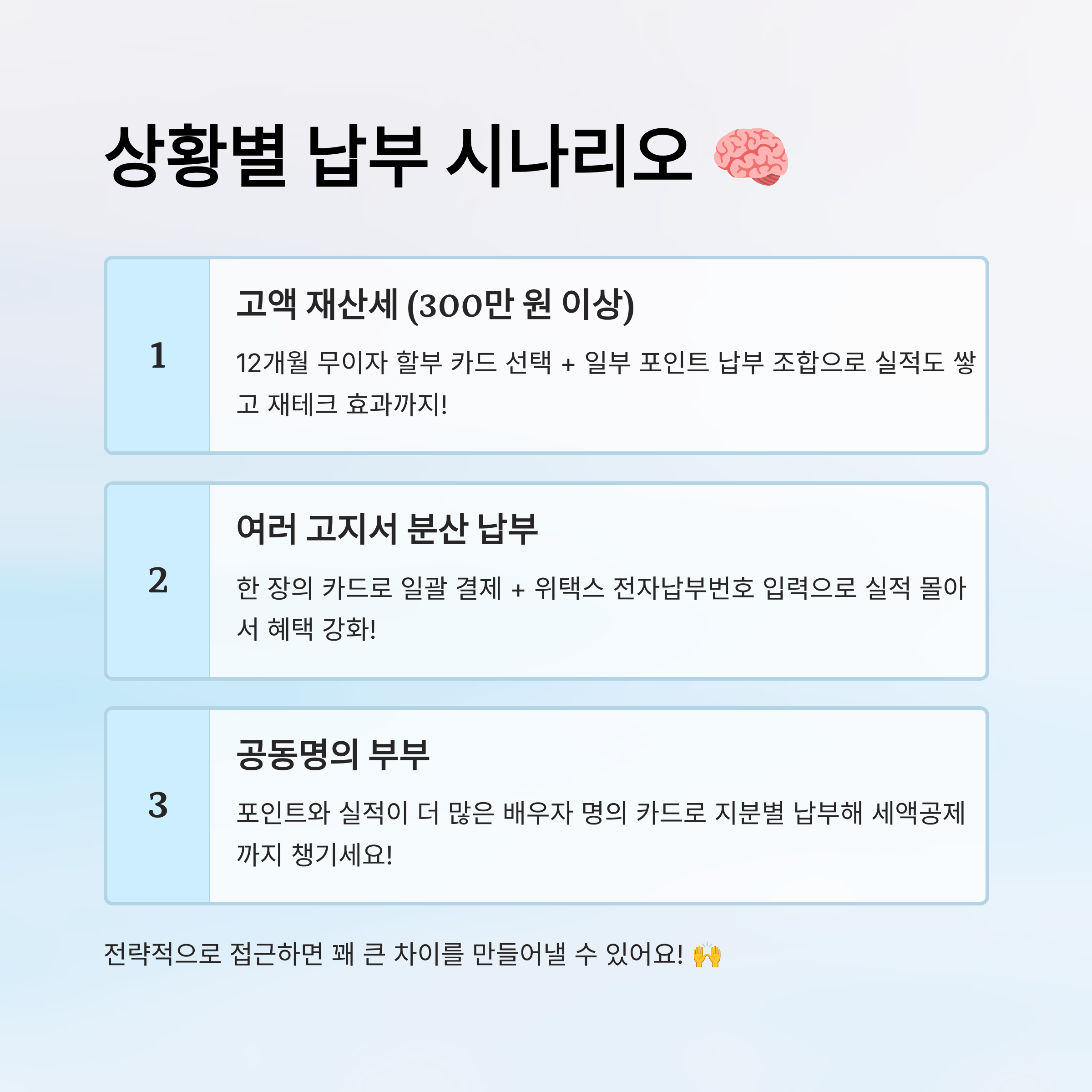그리고 '내가 생각했을 때' 가장 좋은 전략은 바로 **카드 포인트 납부와 무이자 할부를 동시에 활용하는 것**이에요. 실적을 쌓으면서도 부담을 나누고, 포인트로 일부를 차감할 수 있어요.