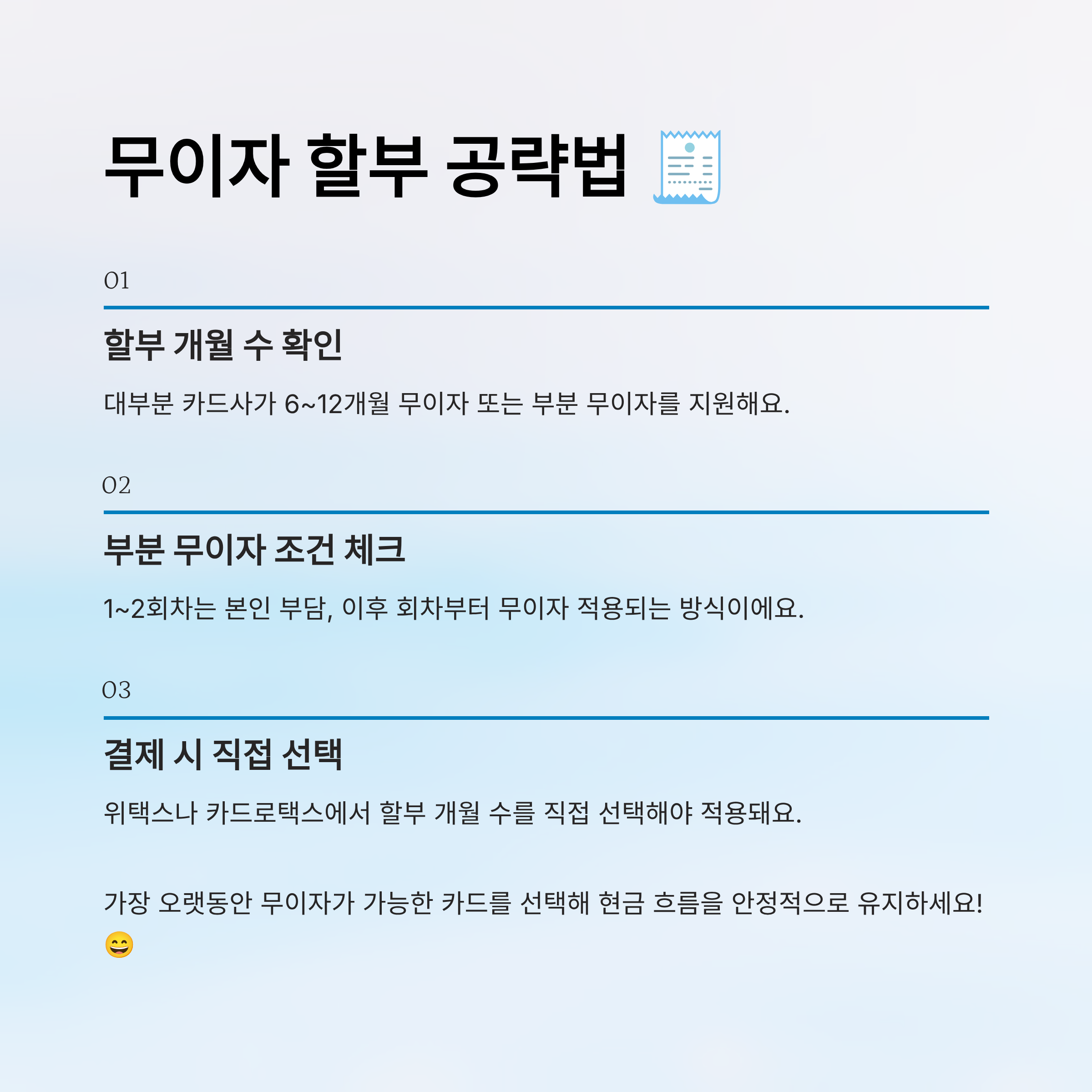 2025년에는 대부분의 카드사들이 6개월에서 12개월까지 무이자 혹은 부분 무이자 할부를 지원하고 있어요. 특히 삼성카드, 국민카드, BC카드는 장기 무이자 구간이 더 넓은 편이에요.