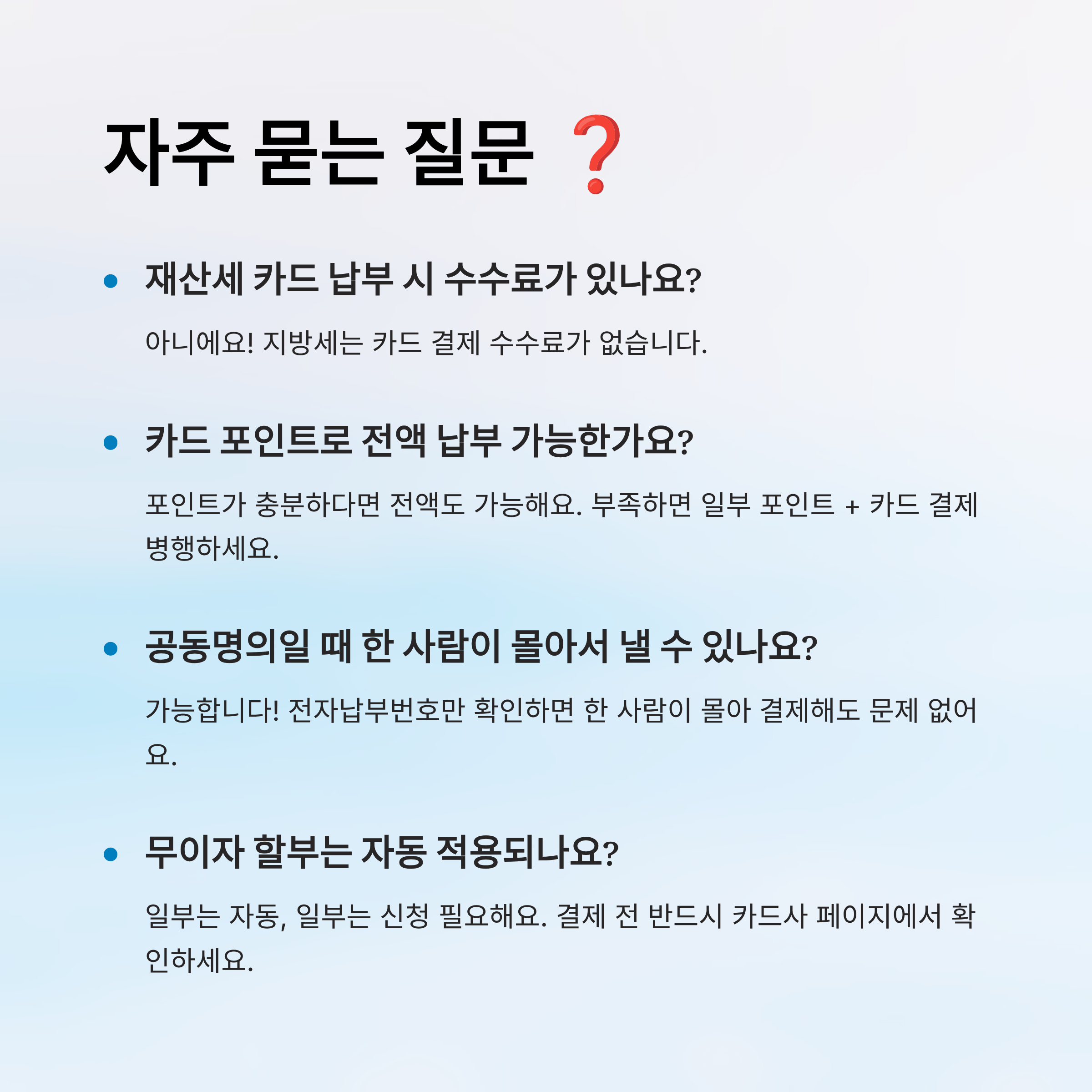 또 하나의 팁은 '공동명의 재산세'예요. 남편과 아내가 공동명의인 경우, 포인트나 실적이 유리한 한쪽 명의의 카드로 몰아서 납부하면 추가 혜택을 누릴 수 있어요. 단, 지분별 납부번호 확인은 필수예요.