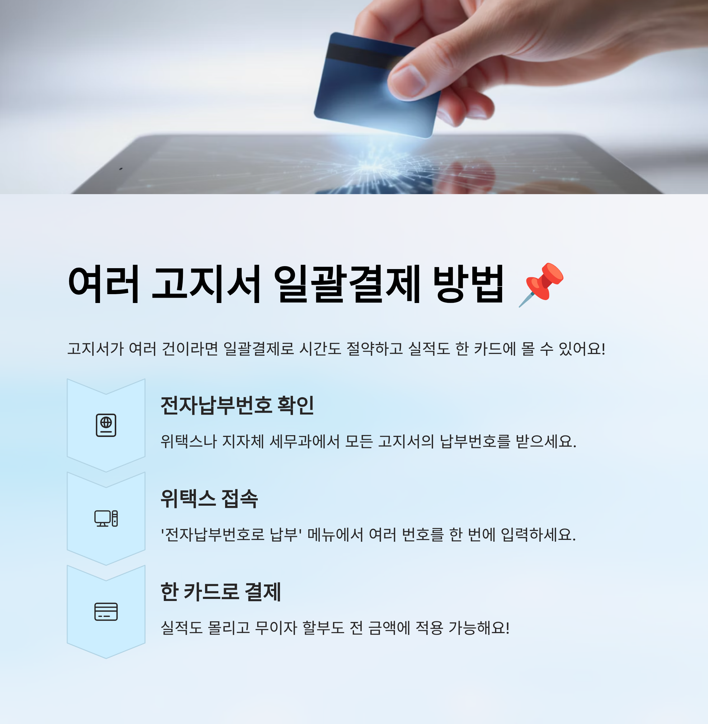 → 한 장의 카드로 일괄 결제 + 위택스 전자납부번호 입력 + 실적 몰아서 혜택 강화!