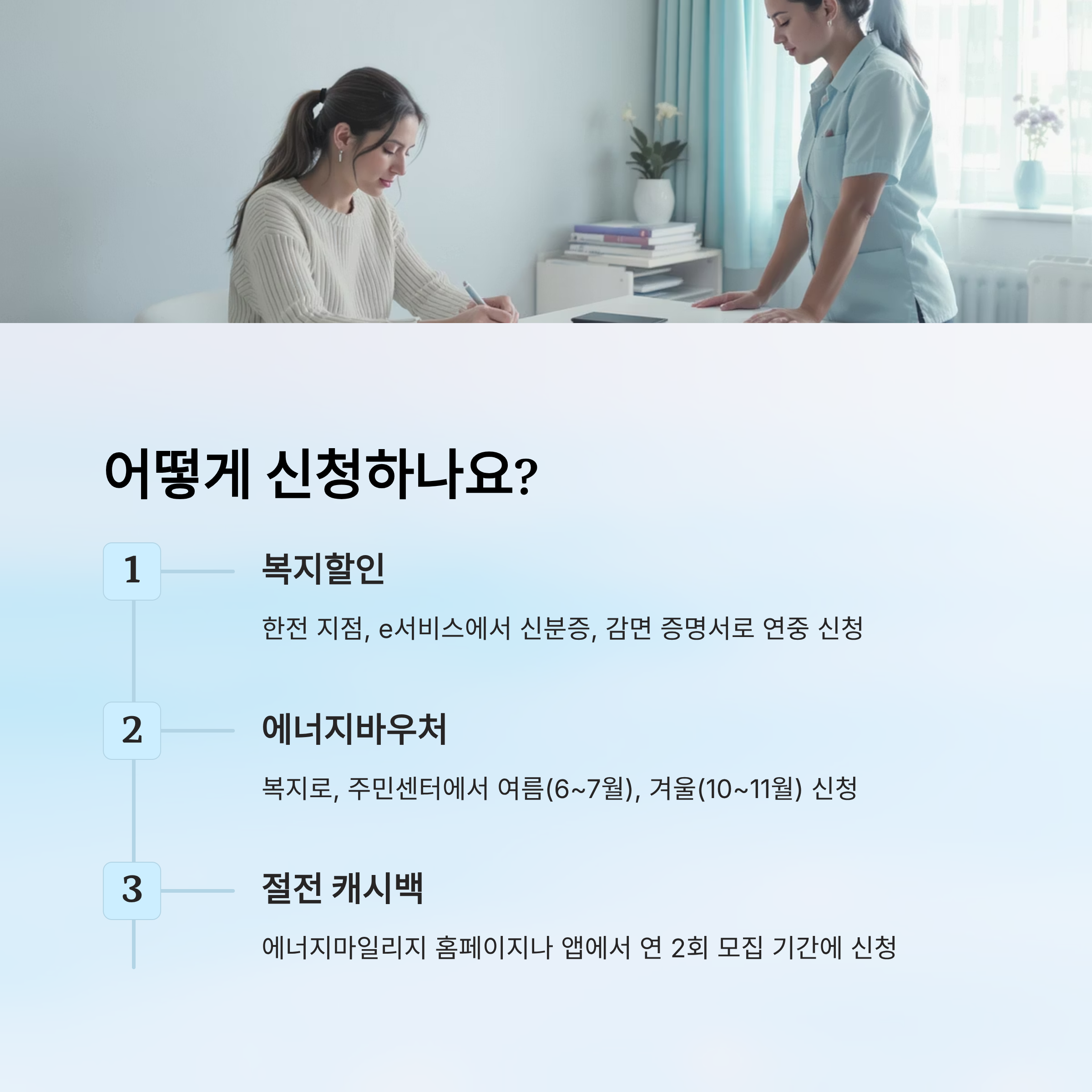 우선 복지할인의 경우, 한국전력공사 지사 또는 고객센터, 또는 온라인 한전 사이버지점(e서비스)에서도 신청이 가능해요. 본인 확인 서류와 감면 대상 증명서(수급자 증명서, 장애인 등록증 등)를 제출하면 1~2개월 내 적용된답니다.