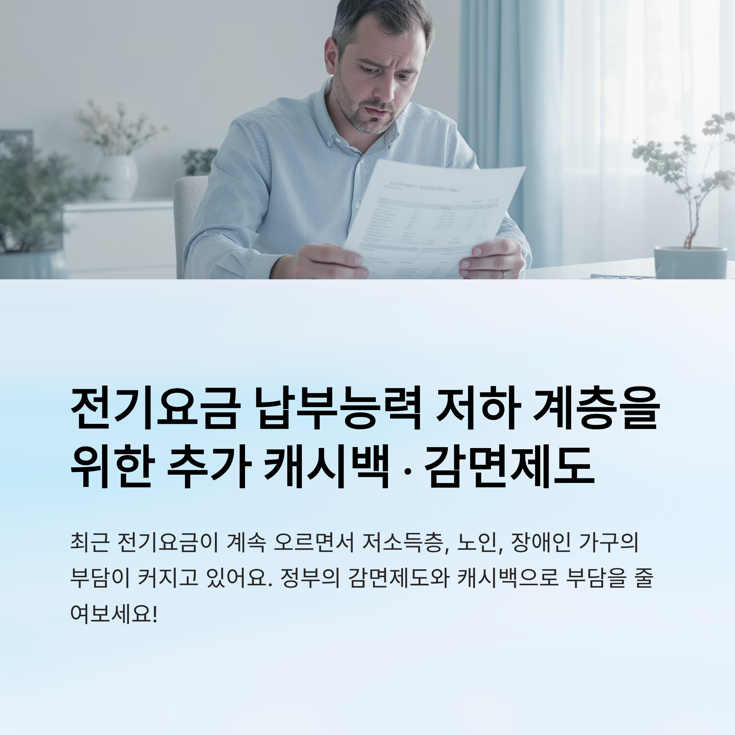 이에 따라 정부는 ‘전기요금 납부능력 저하 계층’을 위한 감면제도와 더불어 한시적인 캐시백 제도도 확대하고 있어요. 이 제도는 단순 요금 할인에서 나아가, 에너지 효율화 유도와 자립 기반 조성을 함께 돕고 있다는 점에서 큰 의미가 있어요.