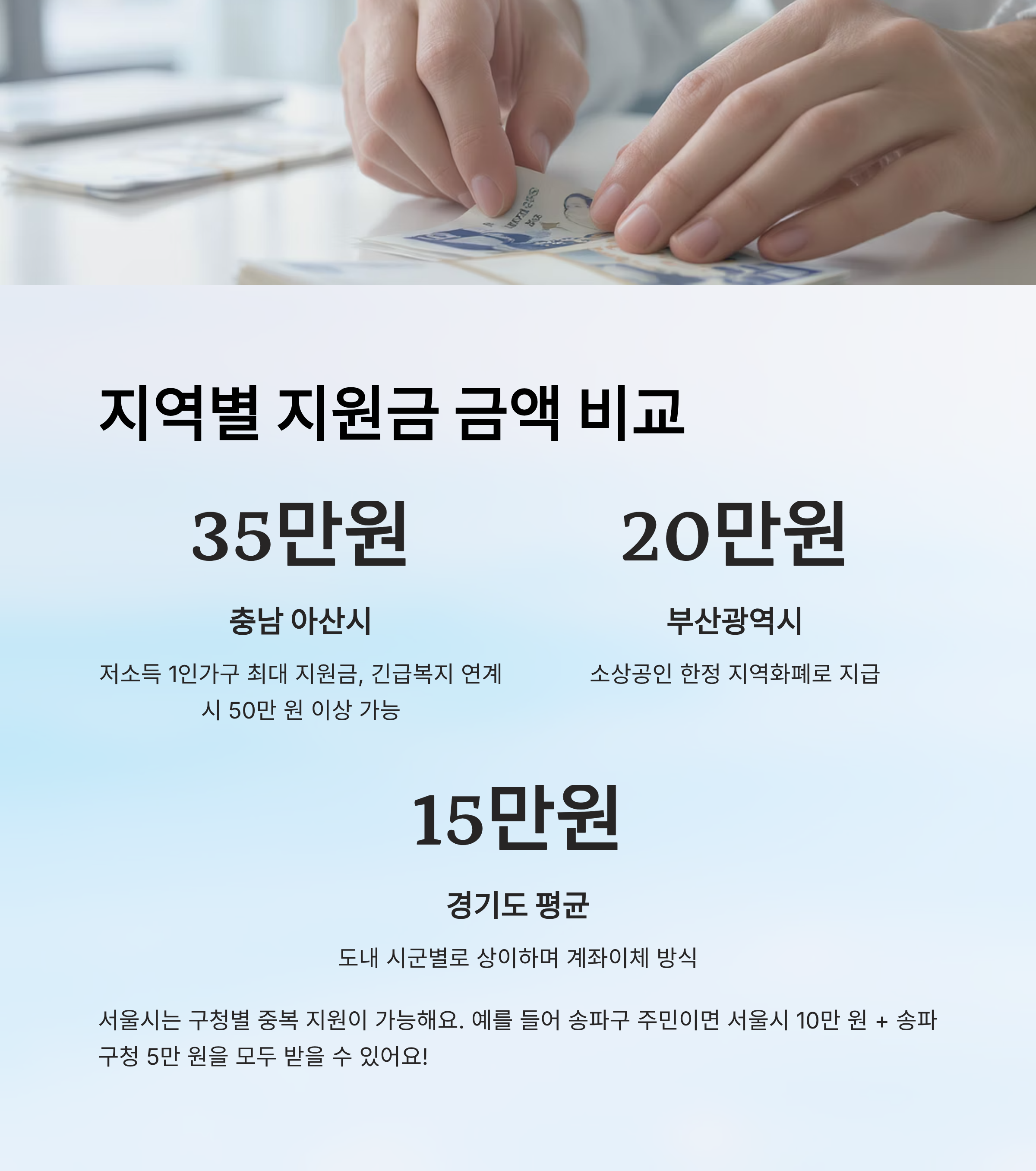 서울시는 모든 구청이 참여하는 형태로 중복 지원도 가능해요. 예를 들어 송파구 주민이면서 서울시민이라면 ‘서울시 10만 원 + 송파구청 5만 원’ 식으로 두 번 받을 수 있어요. 반면 울산이나 제주도는 추가 예산 확보가 어려워 정부 지원금 외에는 따로 지급되지 않는 지역도 있어요.