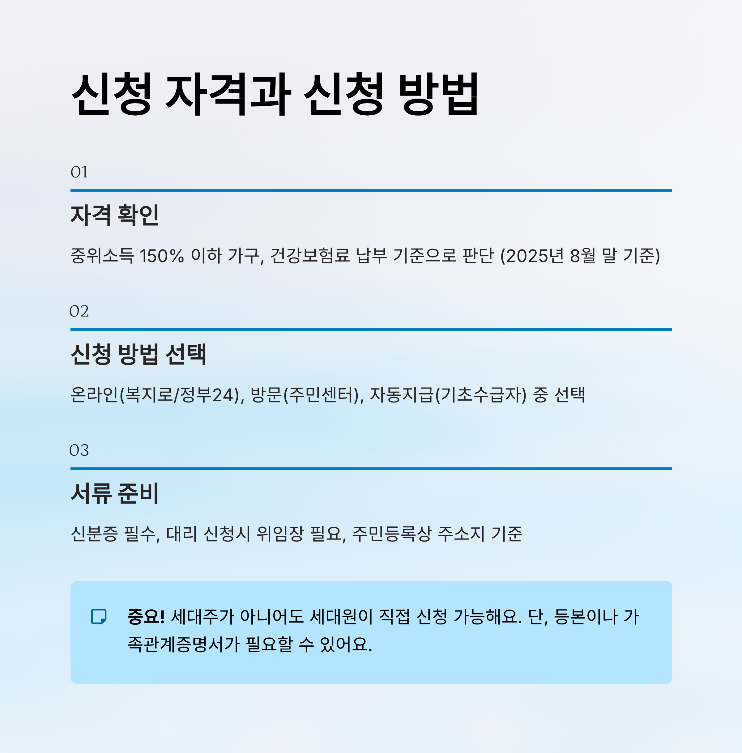 신청 방법은 보통 3가지예요. 온라인 신청(복지로 또는 각 지자체 사이트), 방문 신청(주민센터), 자동 지급(기초수급자는 별도 신청 없이 지급) 방식이에요.