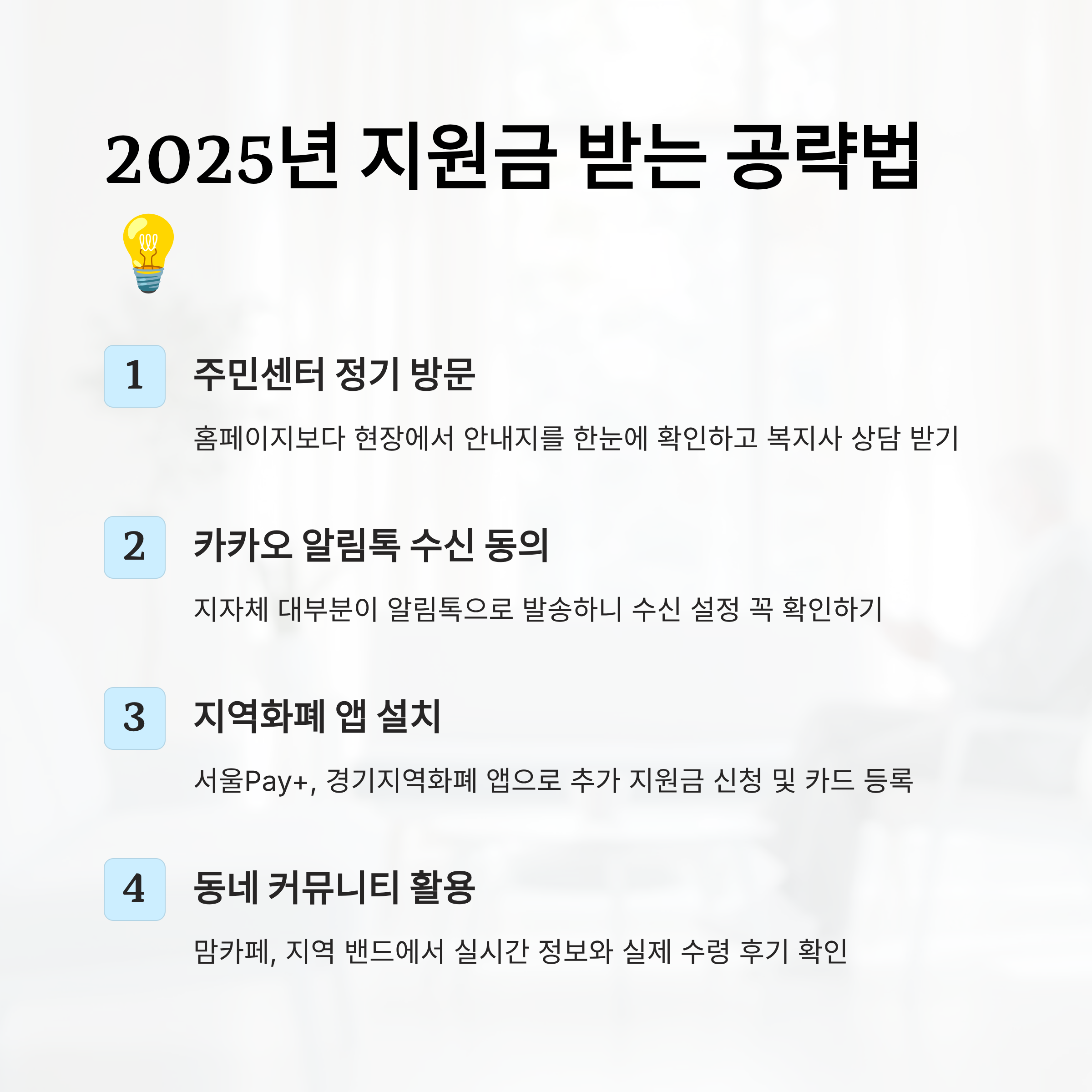 2025년에는 단순히 신청하는 걸로 끝나지 않아요. 자동 지급과 별도 신청을 구분하고, 꼭 서류를 갖춰야 받을 수 있는 지역도 있거든요. 놓치지 않기 위한 전략이 필요해요!