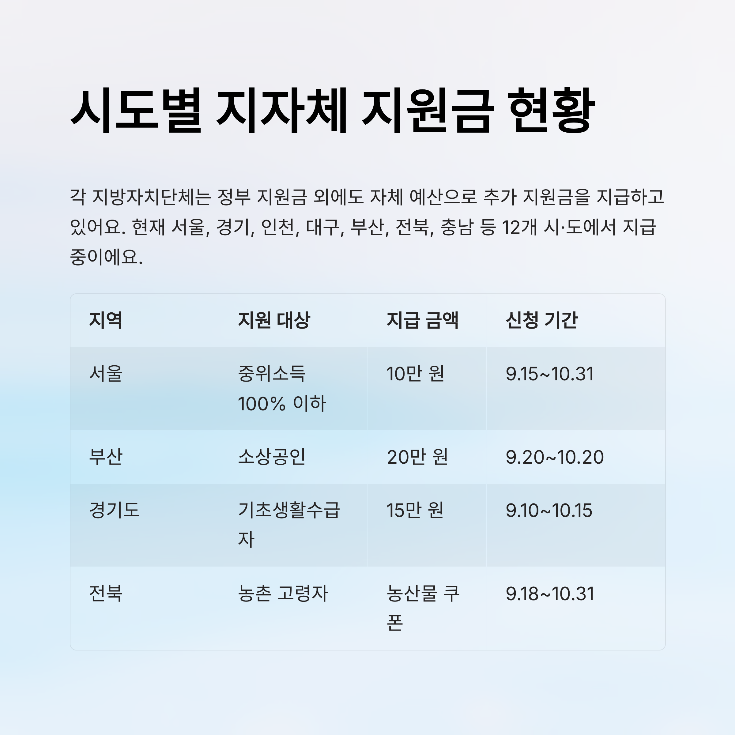 예를 들어 서울시는 중위소득 100% 이하 가구에 1인당 10만 원의 추가 지원금을 제공하고 있고, 부산은 영세 자영업자에게 20만 원의 지역화폐를 지급 중이에요. 반면 일부 지자체는 예산 문제로 지급이 어려운 상황이기도 해요.