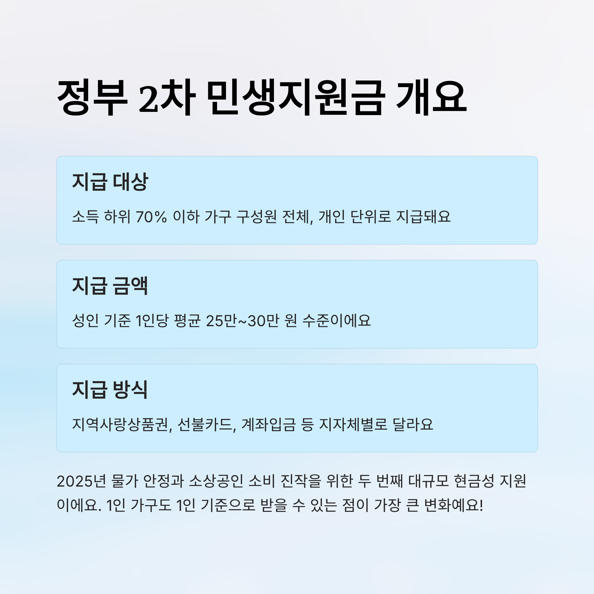 2025년 정부는 고물가와 경기 침체에 대응하기 위해 2차 민생지원금을 발표했어요. 이번 지원금은 전국민 또는 특정 소득계층을 대상으로 하는 전국 단위 정책이에요.