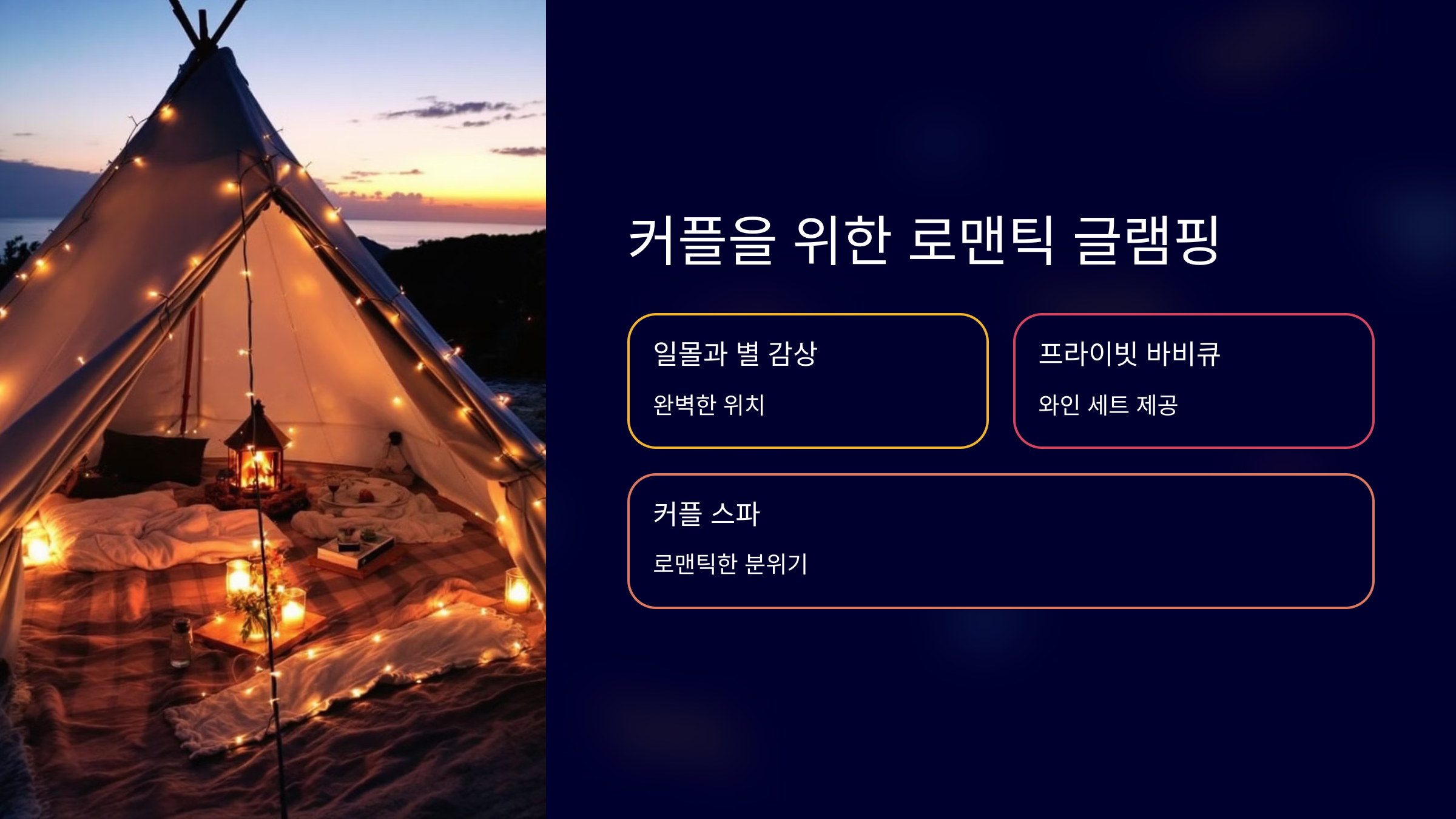 제주도의 로맨틱 글램핑은 사랑하는 사람과의 여행을 더욱 특별하게 만들어줍니다.