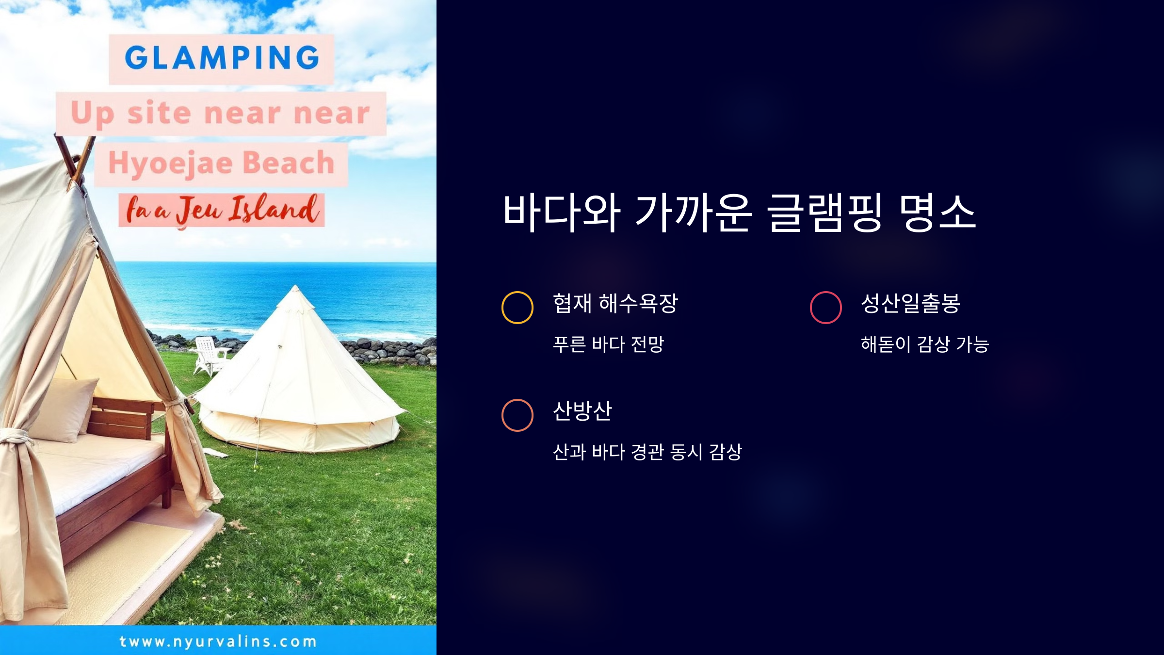 제주도에는 바다와 가까운 글램핑 명소가 다양하게 위치하고 있습니다.