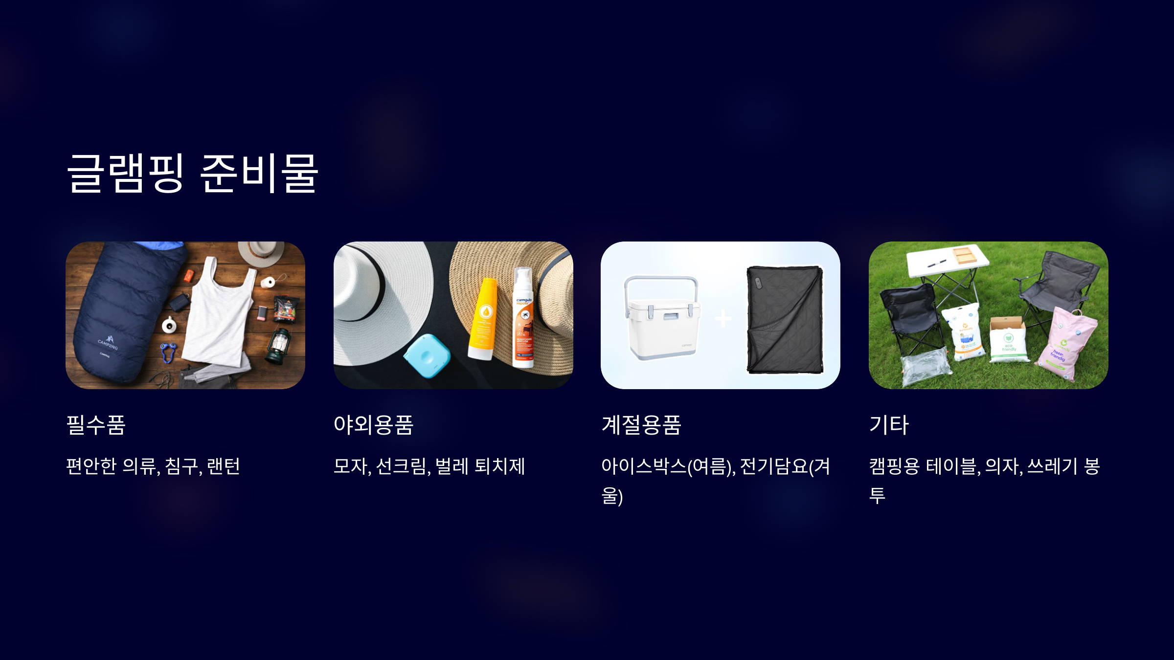 제주도 글램핑을 위해 기본적인 준비물은 다음과 같습니다.