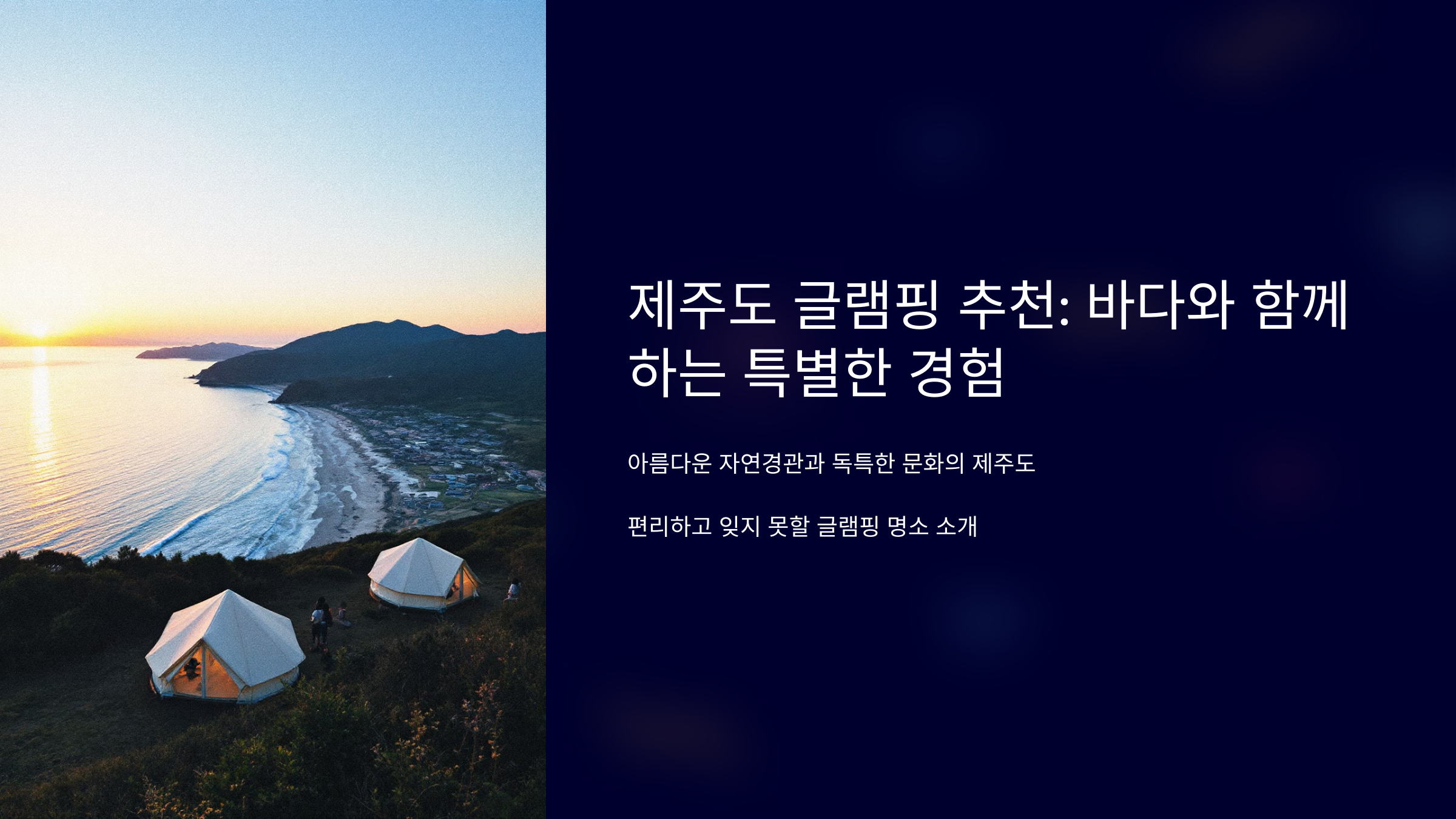 제주도는 아름다운 자연경관과 독특한 문화로 많은 사람들의 사랑을 받는 국내 여행지입니다. 제주에서의 글램핑은 바다와 자연 속에서 특별한 경험을 할 수 있는 방법 중 하나입니다. 편리하면서도 잊지 못할 순간을 만들어주는 제주도의 글램핑 명소들을 소개합니다.