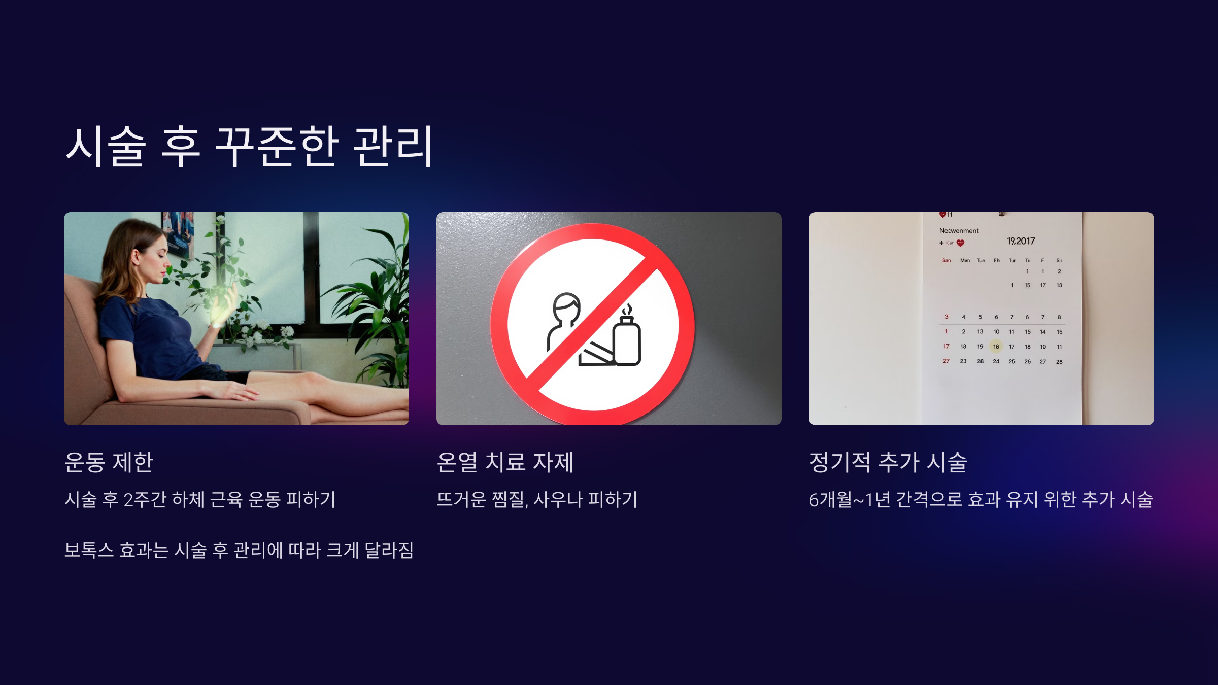 보톡스의 효과는 시술 후 관리에 따라 크게 달라질 수 있습니다.