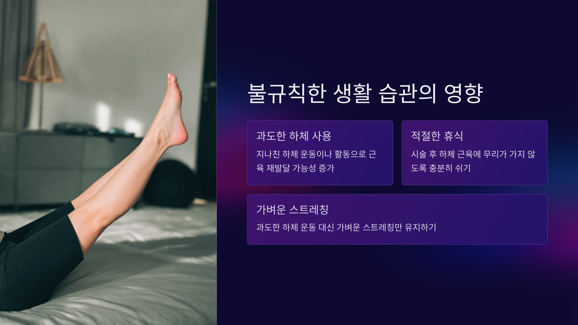 - 과도한 하체 운동은 피하고 가벼운 스트레칭만 유지