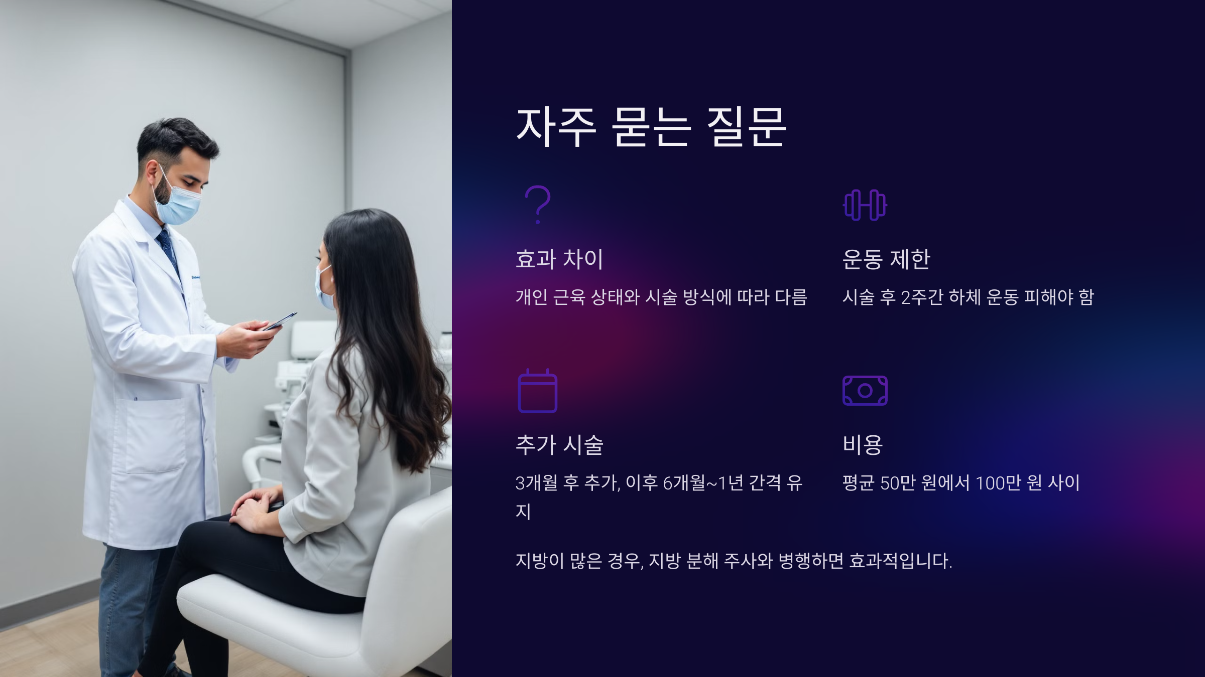 - 지방이 많은 경우, 지방 분해 주사나 지방흡입 등 다른 시술과 병행할 수도 있습니다.