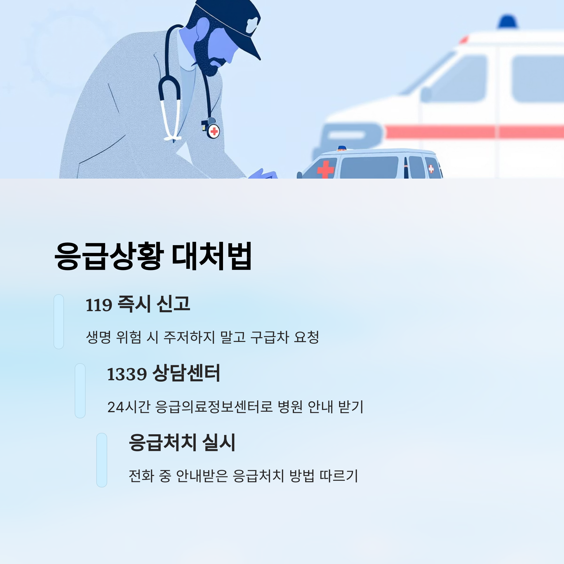 갑작스럽게 열이 오르거나 복통, 호흡곤란 등 응급 상황이 발생했을 때 가장 중요한 건 ‘당황하지 않는 것’이에요. 상황을 빠르게 판단하고 적절한 병원을 선택하는 게 관건이에요. 먼저 생명이 위협될 수 있는 경우엔 주저하지 말고 119에 전화해요. 이건 가장 빠르고 안전한 방법이에요.