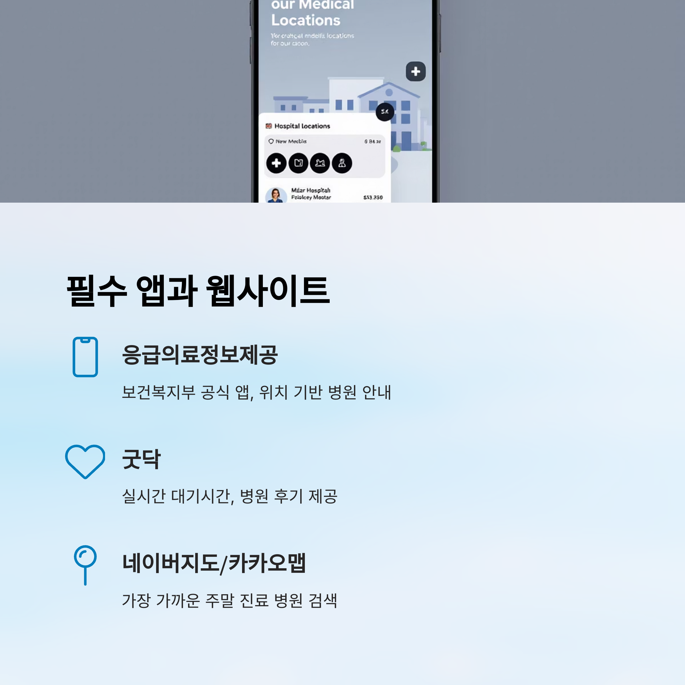 주말 병원을 빠르게 찾으려면, 스마트폰 앱은 정말 든든한 도우미예요. ‘응급의료정보제공’ 앱은 보건복지부에서 제공하며, 위치 기반으로 문 여는 병원과 약국을 안내해줘요. 특히 ‘야간 진료’와 ‘일요일 진료’ 항목이 따로 있어 정말 편리하죠.
