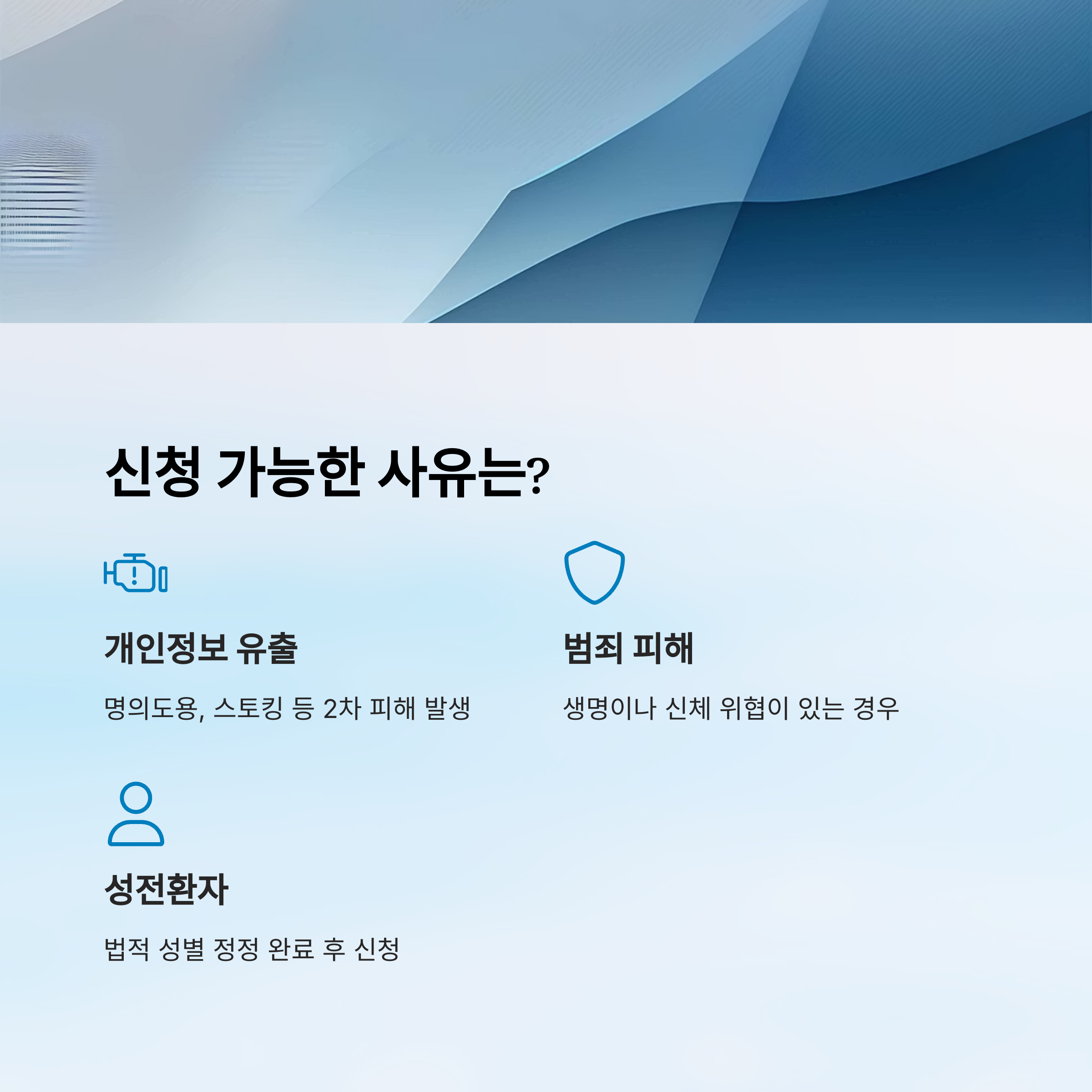 개인정보가 유출돼서 명의도용, 스토킹, 보이스피싱 같은 2차 피해가 발생했거나, 그런 우려가 명확할 때 신청할 수 있어요. 예를 들어 인터넷에 주민번호가 노출돼서 이상한 전화나 문자가 계속 온다면 사유로 인정받을 수 있어요.