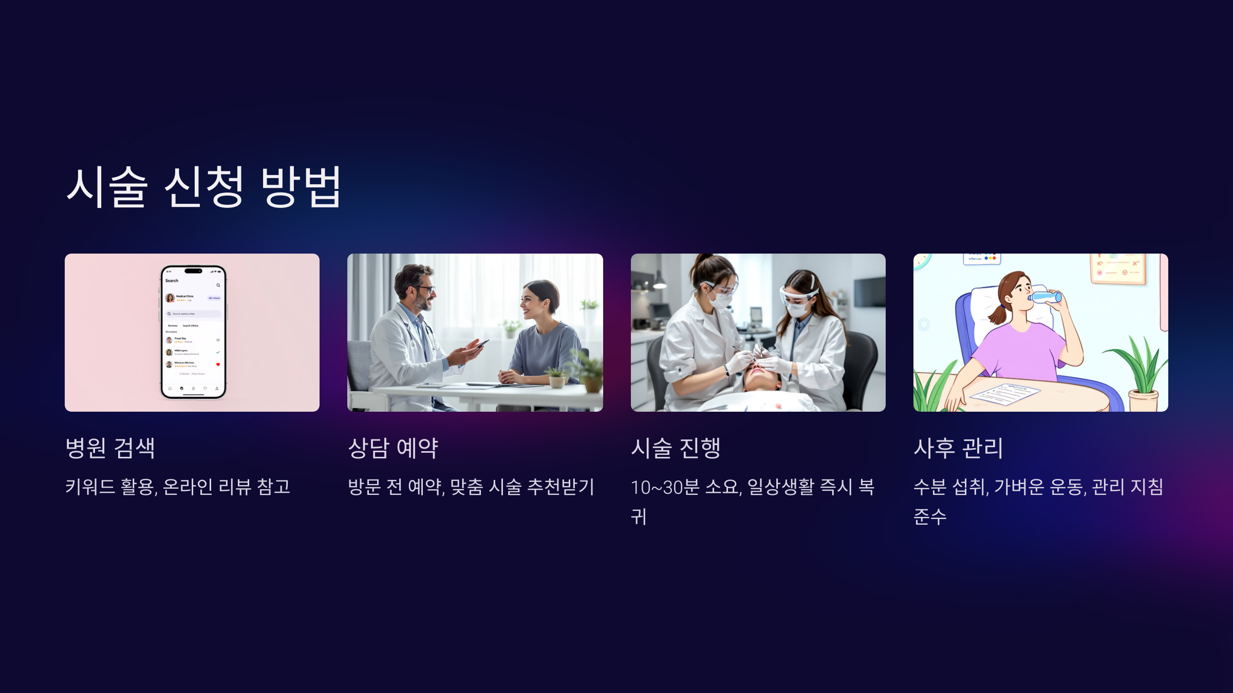 - 상담 시 본인의 상태에 맞는 시술을 추천받고, 장단점을 확인하세요.