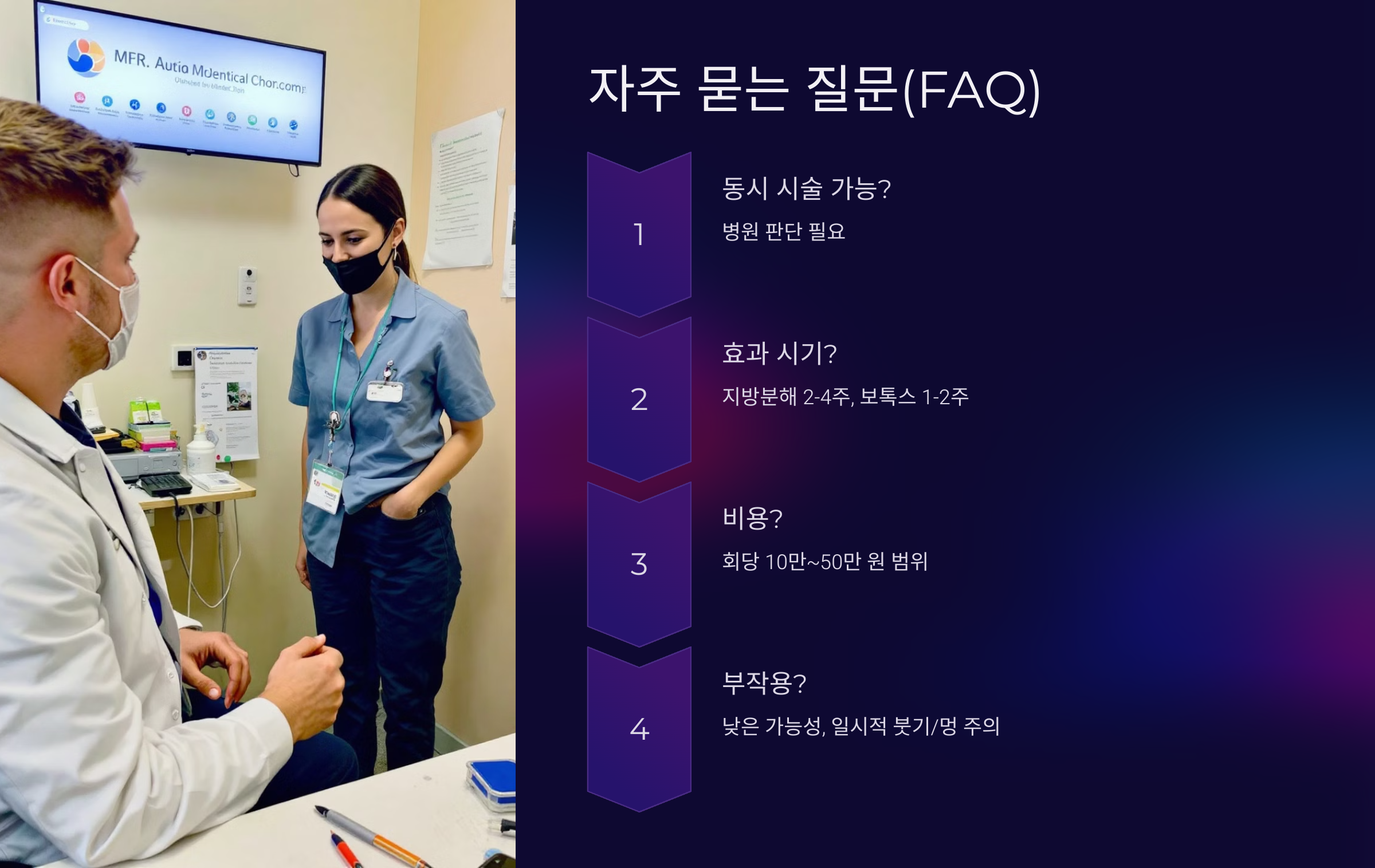 - 숙련된 의료진이 시술하면 부작용 가능성은 낮습니다. 다만, 시술 후 붓기나 멍이 생길 수 있으니 주의하세요.