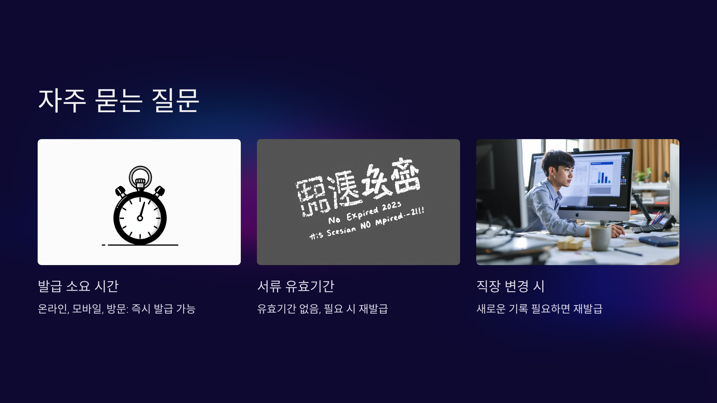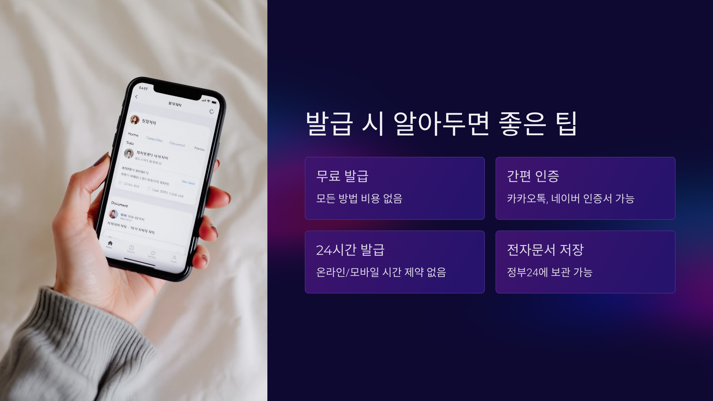 - 24시간 발급 가능: 온라인과 모바일 발급은 시간 제약 없이 이용할 수 있습니다.