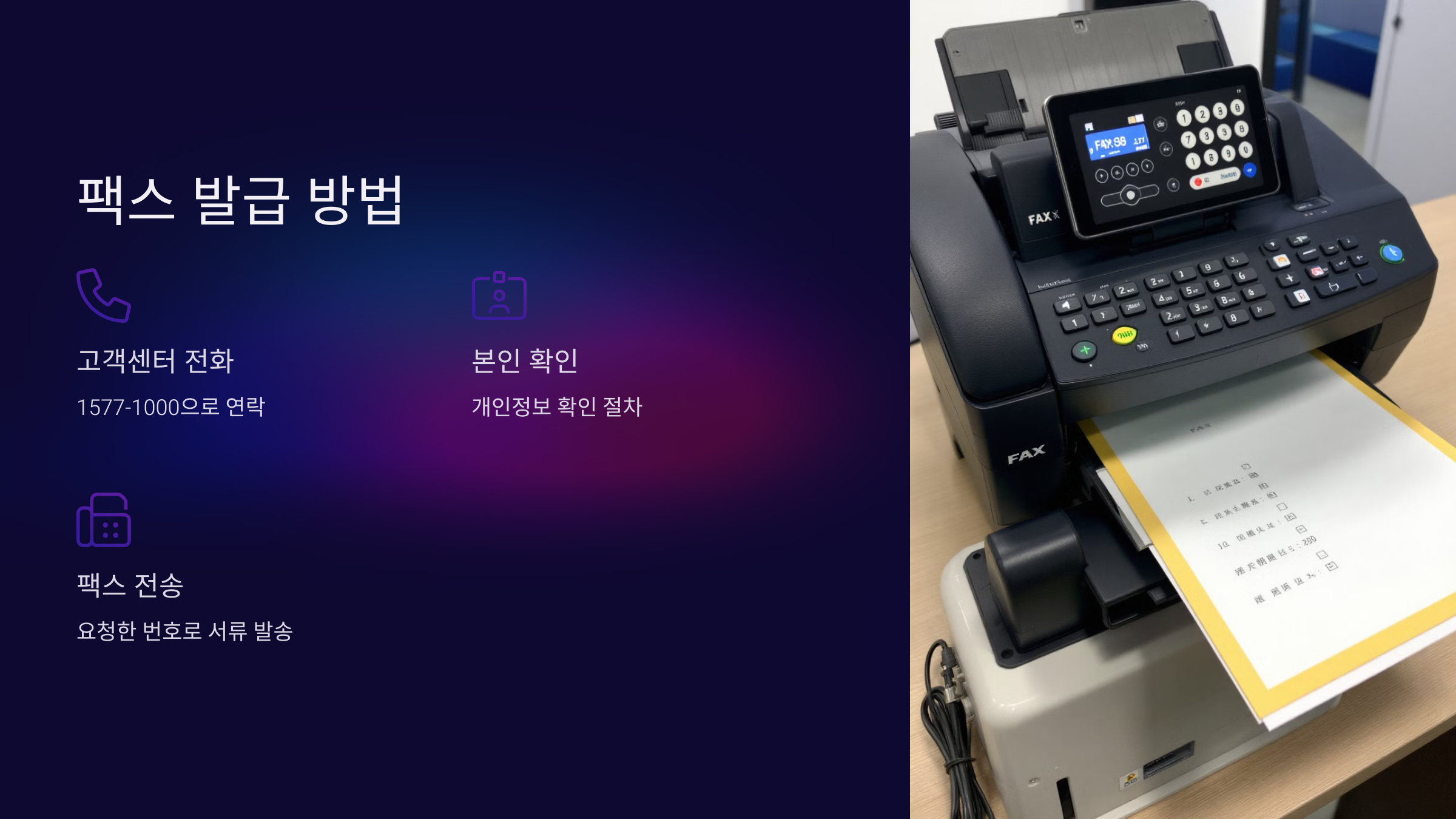 팩스가 가능한 환경이라면 고객센터를 통해 팩스로 서류를 받을 수 있습니다.
