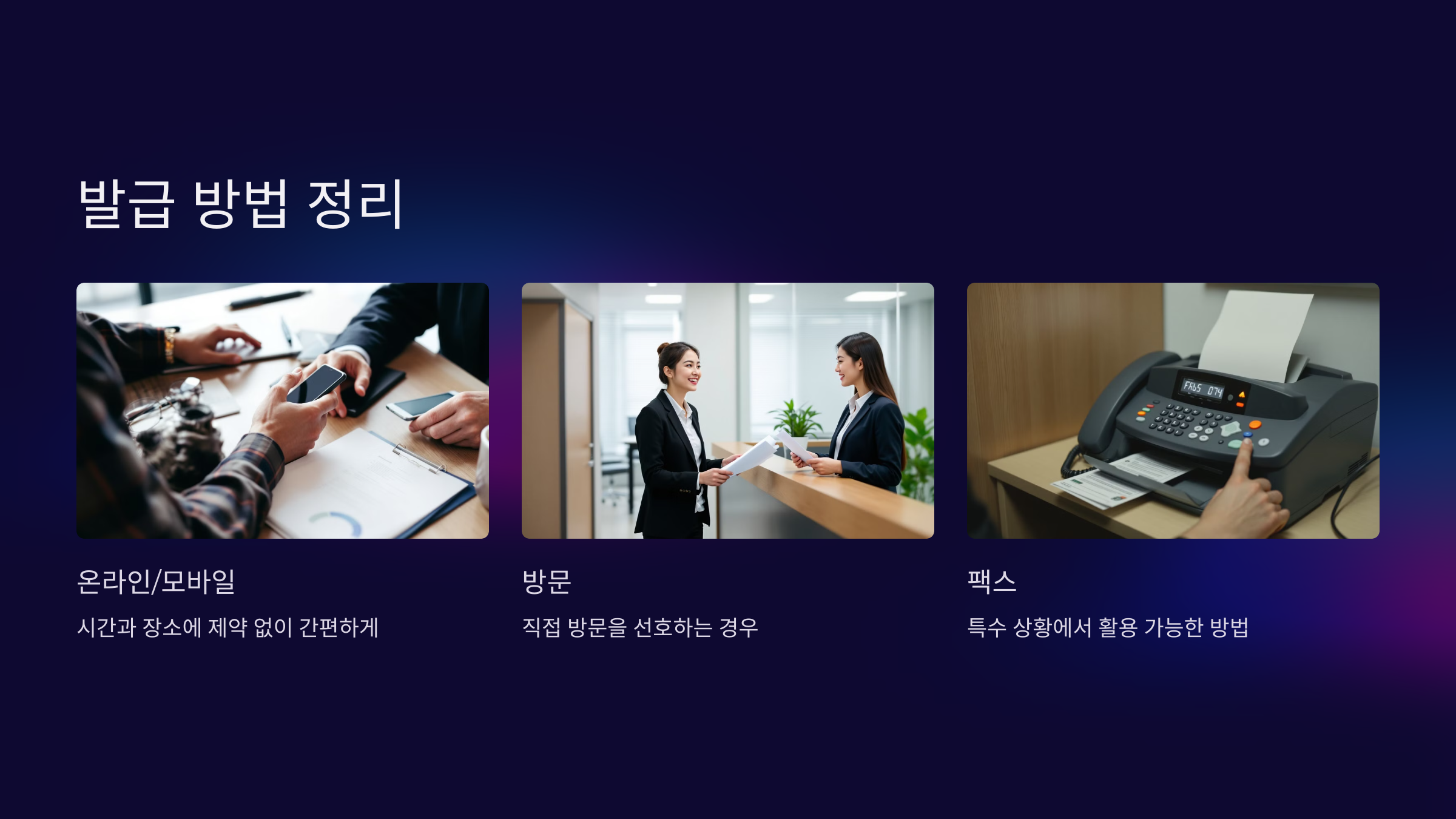 온라인과 모바일 발급은 시간과 장소에 구애받지 않아 가장 추천드리고, 방문과 팩스도 상황에 따라 유용합니다.