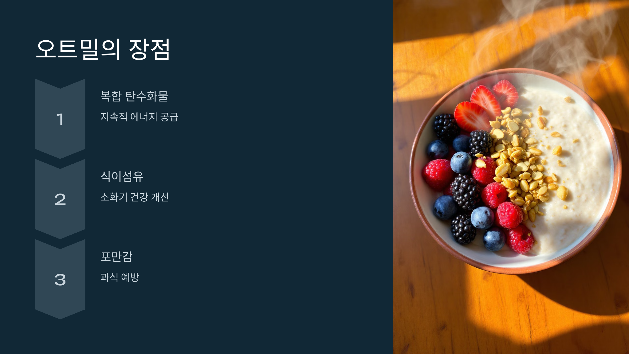 오트밀은 복합 탄수화물로, 에너지를 지속적으로 공급하며 포만감을 유지합니다.
