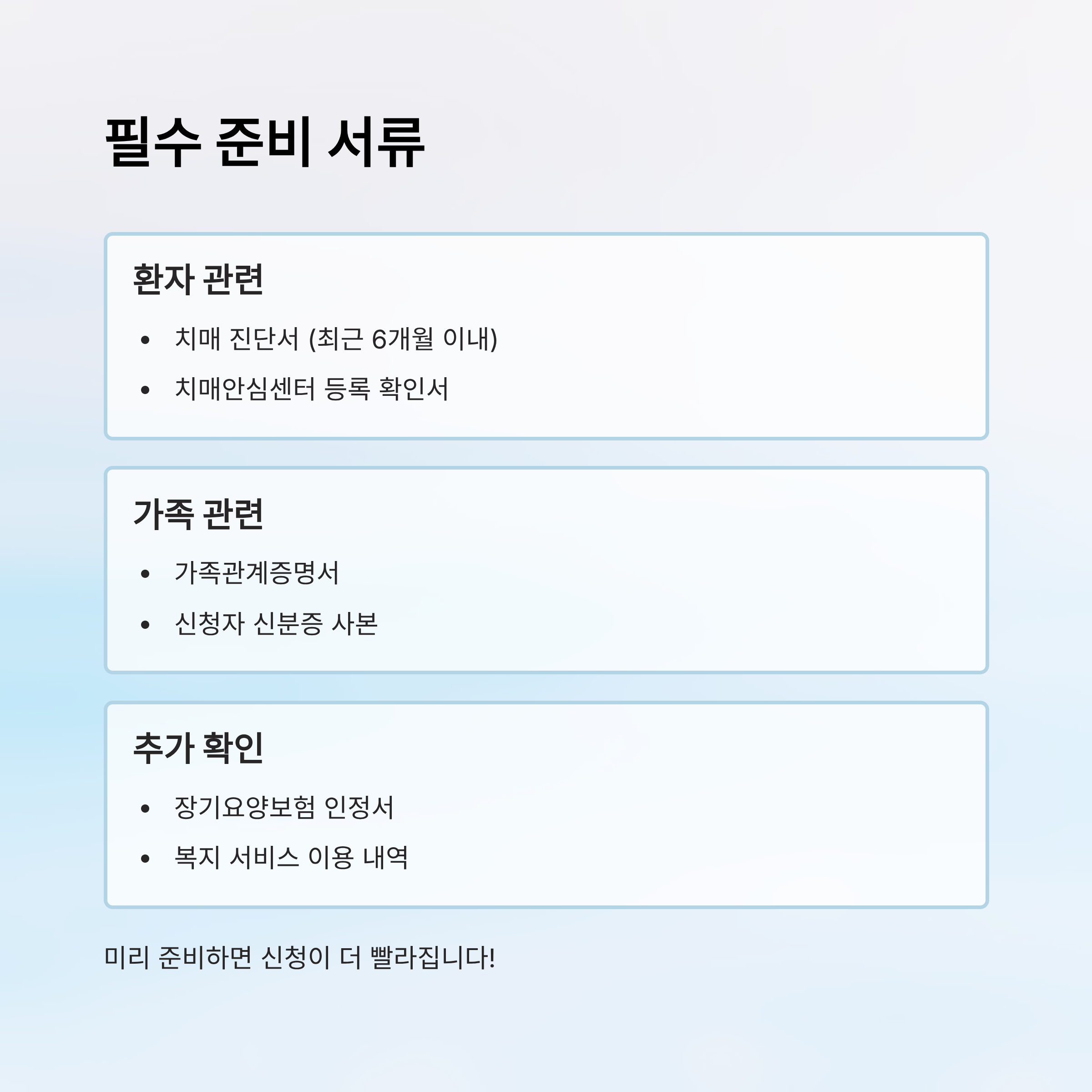 | 환자 관련 | 치매 진단서, 치매안심센터 등록 확인서 | 병원, 치매안심센터 | 최근 6개월 이내 |