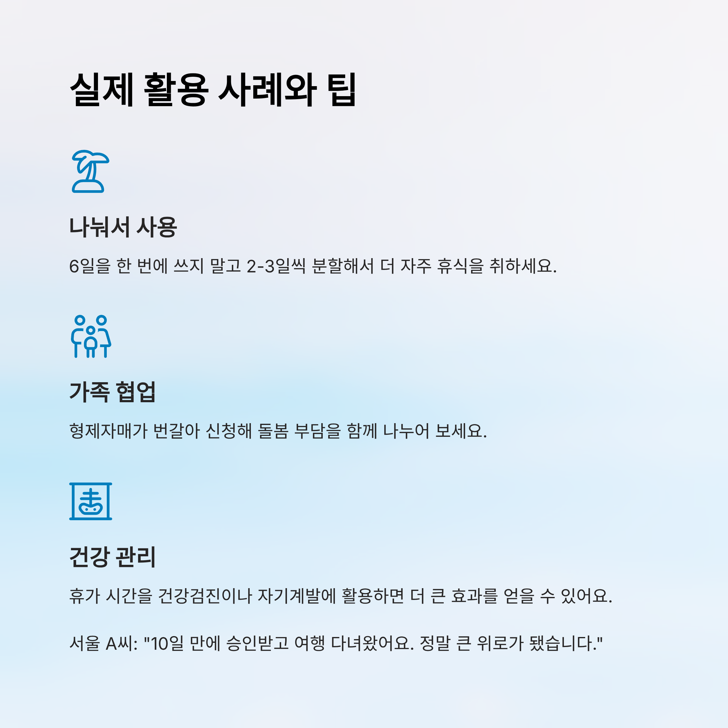 활용 팁에서 가장 중요한 건 "나눠 쓰기"예요. 꼭 6일을 한 번에 몰아서 쓰지 않아도 돼요. 상황에 맞게 하루, 이틀씩 나누어 쓰면 돌봄 공백도 줄이고, 더 자주 숨 쉴 시간을 만들 수 있어요.