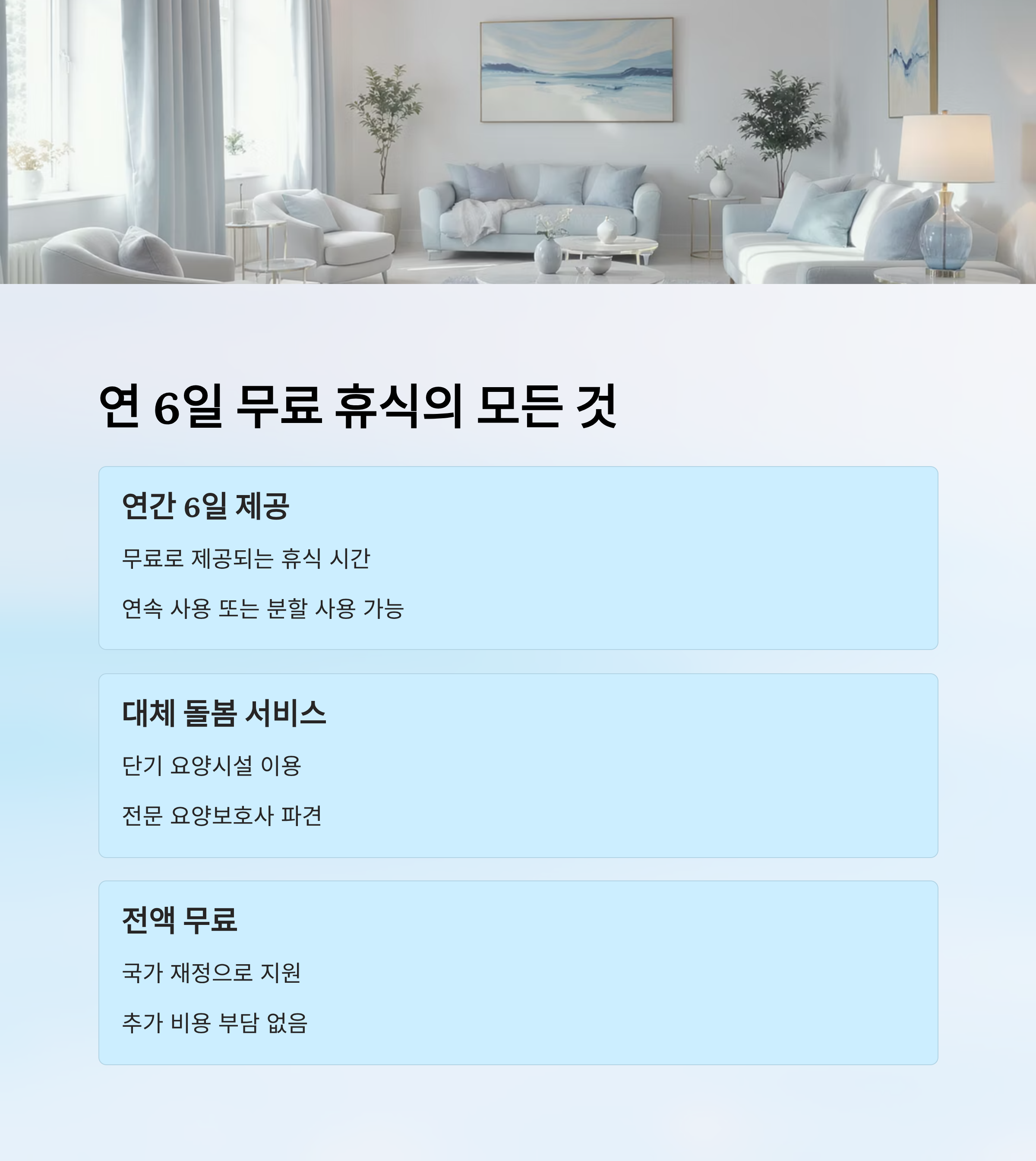 치매가족휴가제의 핵심은 바로 연간 6일 동안 제공되는 무료 휴식이에요. 이 6일은 단순한 휴가가 아니라, 가족이 환자 돌봄에서 벗어나 충분한 휴식을 취할 수 있도록 제도적으로 보장되는 시간이랍니다. 돌봄 가족이 휴가를 떠나는 동안 환자는 지정된 단기 보호 시설이나 전문 요양 서비스에서 안전하게 돌봄을 받을 수 있어요.