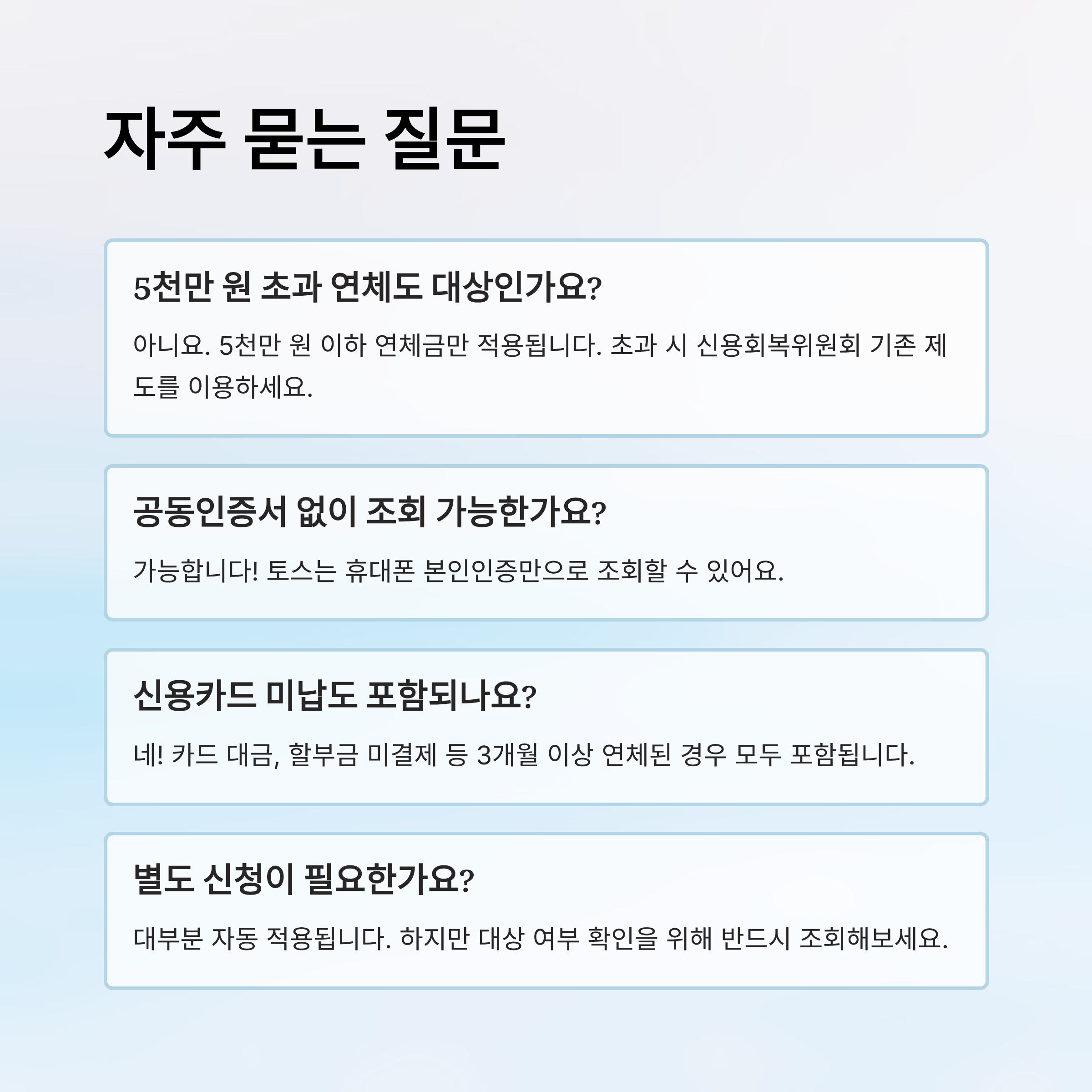 A7. 대부분의 경우 별도 신청 없이도 자동 적용</strong돼요. 다만, 본인이 대상인지 정확히 알기 위해선 토스·나이스·정부24 등에서 반드시 조회</strong해보는 게 좋아요.