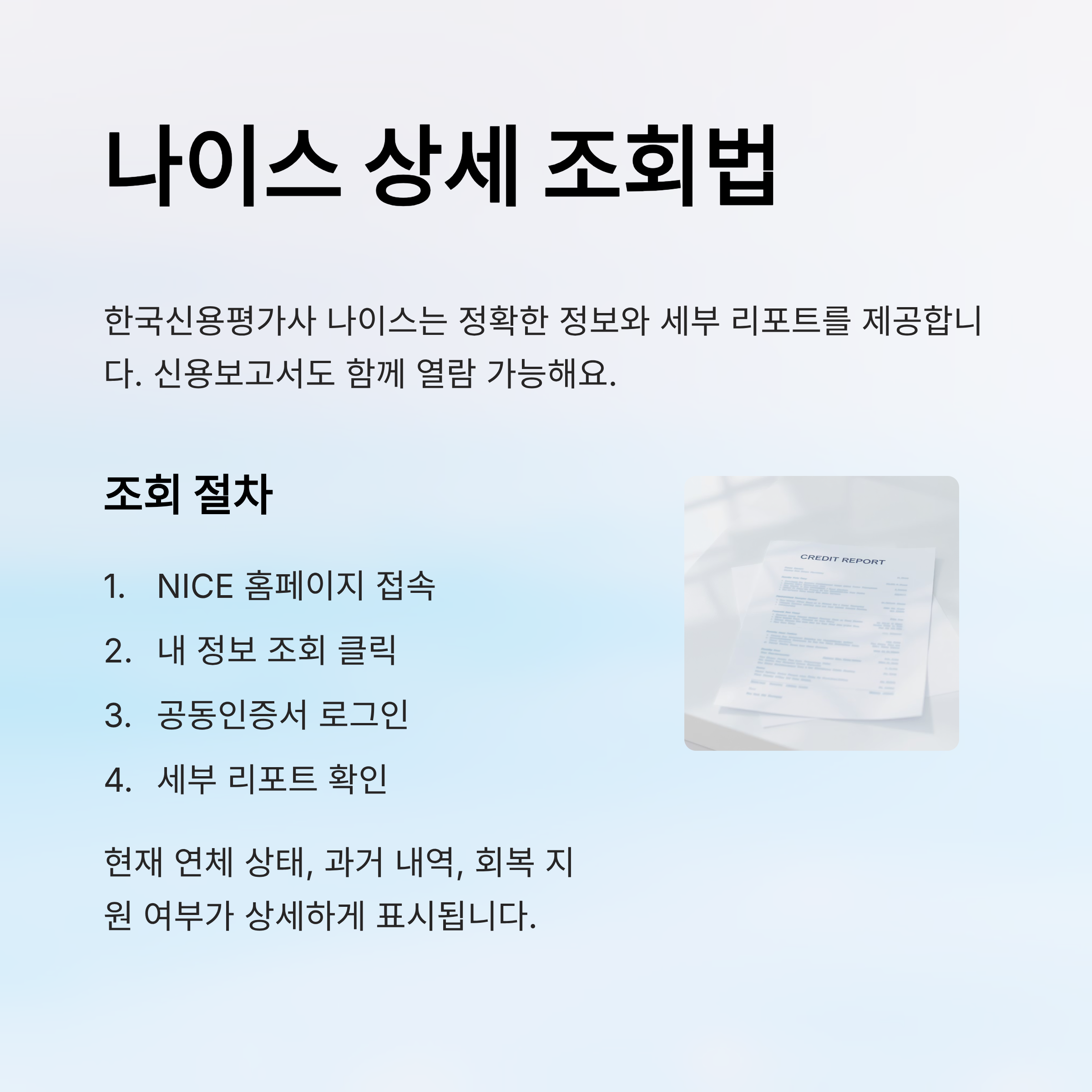 NICE는 공동인증서 또는 아이핀으로 로그인해야 하는 경우가 있어요. 그리고 인증 후에는 신용회복 대상 여부가 상세한 리포트 형태로 제공되는데, 현재 연체 상태, 과거 연체 내역, 회복 지원 여부가 세부적으로 표시돼요.📄