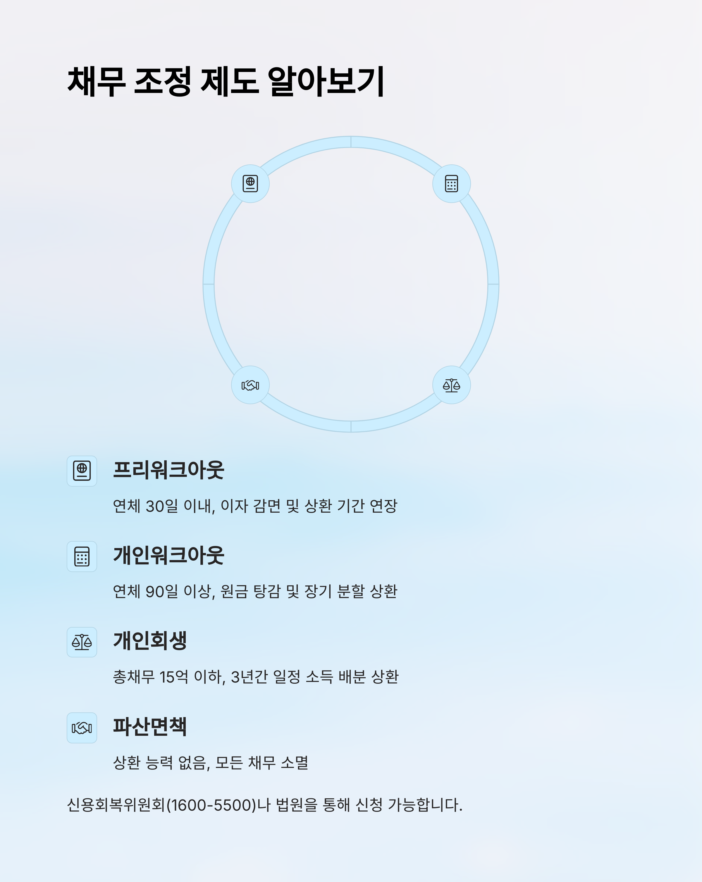 채무 조정은 크게 네 가지로 나뉘어요. 첫째는 '신용회복위원회 워크아웃', 둘째는 '개인회생', 셋째는 '파산면책', 넷째는 '자율 협상형 조정'이에요. 각각의 제도는 적용 대상과 절차가 다르기 때문에 본인 상황에 맞는 것을 선택하는 게 중요하답니다.