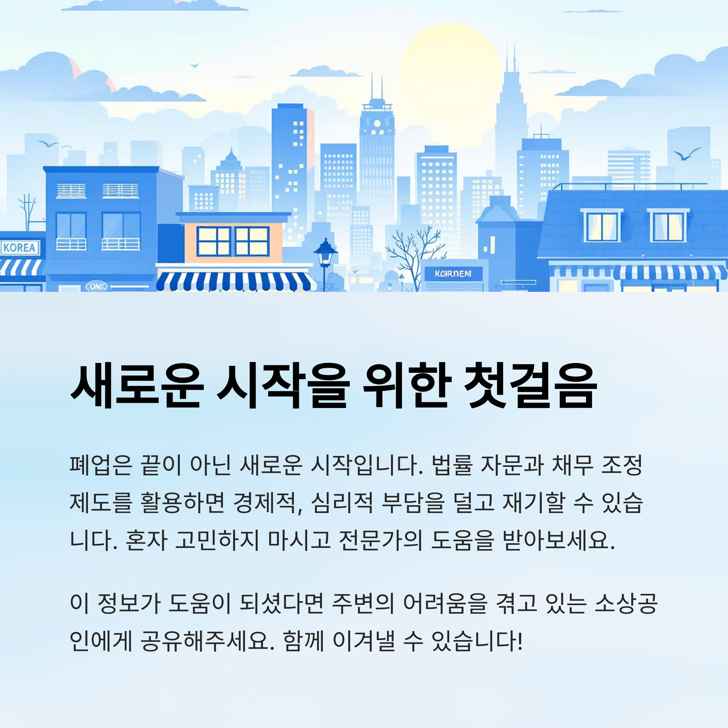 폐업은 끝이 아니라 새로운 시작의 과정이에요. 이 시점에 어떤 결정을 하느냐에 따라 1년 후, 3년 후 인생이 달라질 수 있어요. 무작정 버티기보단 제도를 잘 알고, 전문가와 함께 방법을 찾아보세요.