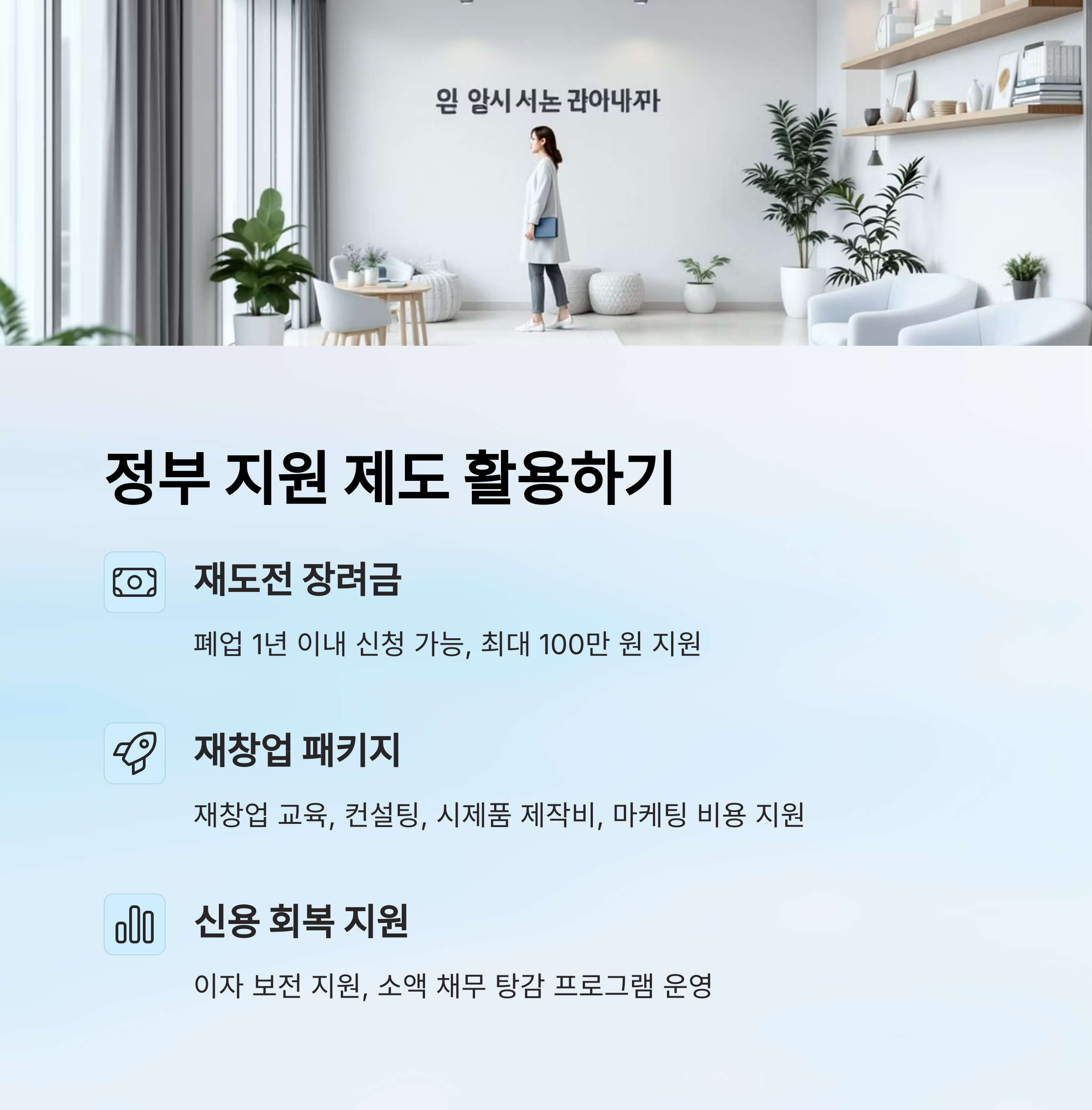 폐업한 소상공인을 위해 정부는 다양한 지원책을 운영하고 있어요. 특히 폐업 직후의 경제적 충격을 줄이고, 재기를 도와주는 제도들이 많이 마련되어 있답니다. 가장 대표적인 제도가 '재도전 장려금'과 '재창업 패키지', 그리고 '신용 회복 지원 프로그램'이에요.