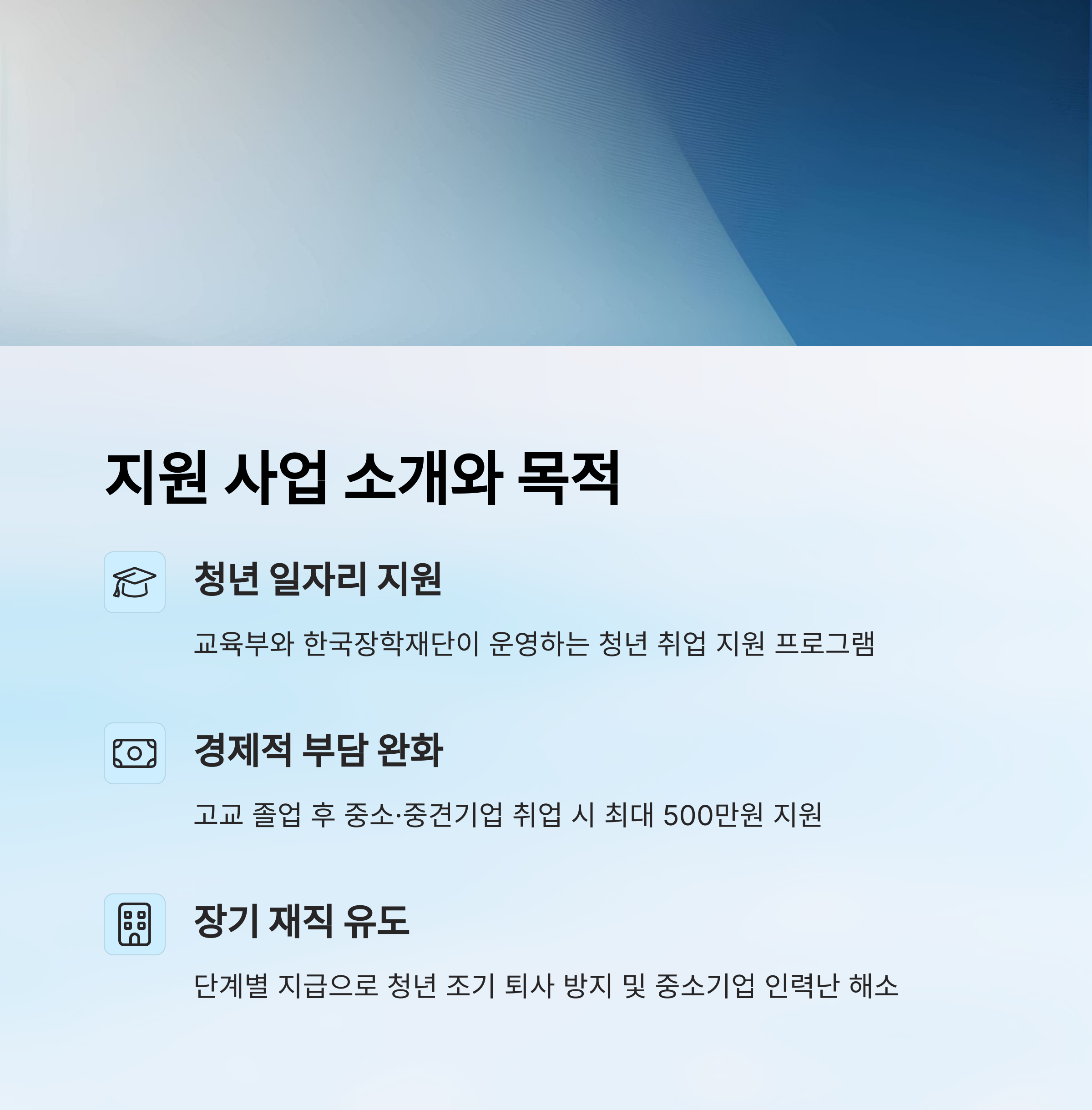 고등학교 졸업 후 바로 중소·중견기업에 취업한 학생들에게 최대 500만 원의 장려금을 지급해 경제적 부담을 덜어주고, 조기 사회 진출을 장려하는 게 목적이죠. 이와 더불어 산업체 채용형 현장실습을 수행하는 학생들에게도 최대 360만 원의 지원금을 제공해요.