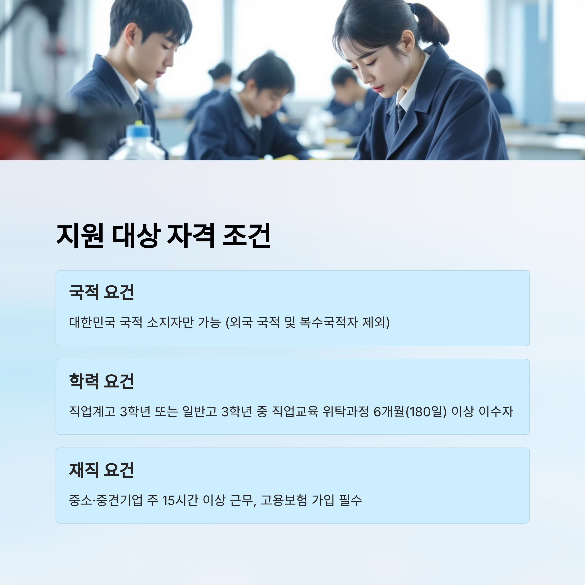 둘째, 2025년 현재 직업계고 3학년 학생이거나, 일반고 3학년이지만 직업교육 위탁과정을 6개월 이상 이수한 학생만 신청할 수 있어요. 위탁과정 참여일 수가 180일 이상이어야 한다는 점도 중요하죠.