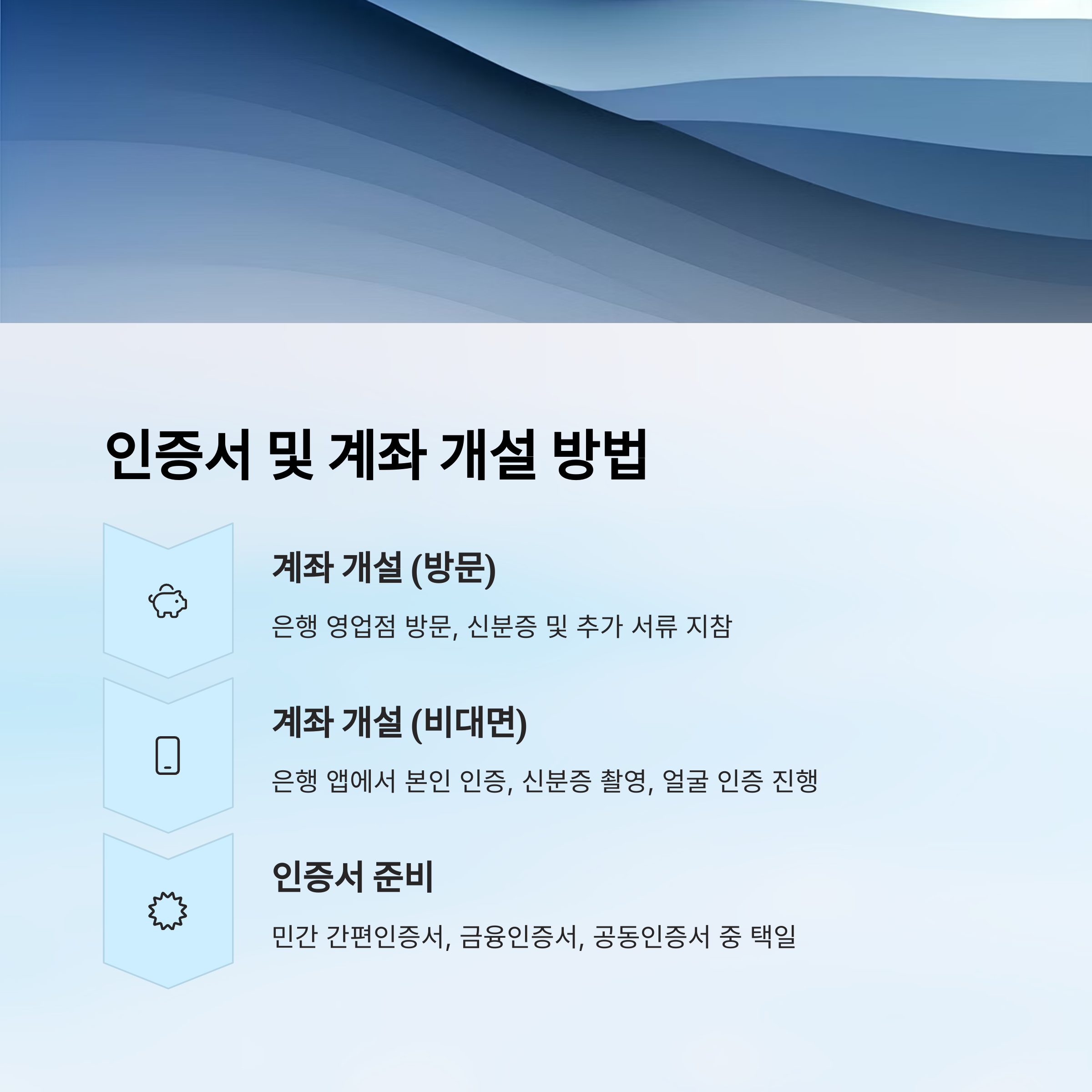 | 계좌 개설 (방문) | 은행 영업점 방문 | 신분증, 추가 서류(필요 시) |