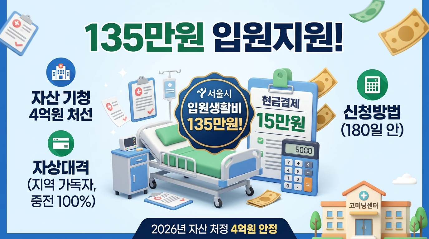 안녕하세요! 오늘은 서울 시민분들에게 정말 든든한 소식을 들고 왔어요. 바로 '2026 서울형 입원생활비 지원' 사업인데요. 제가 아는 지인분도 작년에 갑자기 허리를 다쳐 입원하셨는데, 당장 일당이 안 나오니 병원비보다 생활비 걱정을 더 많이 하시더라고요. 😢 서울시는 이런 취약노동자분들의 걱정을 덜어드리기 위해 2026년부터 지원 기준을 대폭 완화했습니다! 특히 재산 기준이 상향되어 더 많은 분이 혜택을 볼 수 있게 되었는데, 오늘 그 내용을 아주 자세히 파헤쳐 보겠습니다.